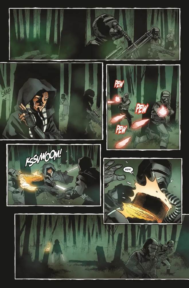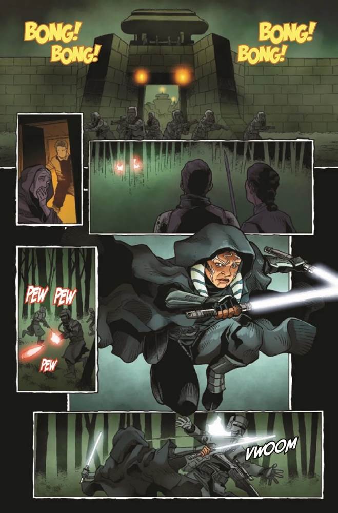 “Chapter 13 - The Jedi" is one of my favorite episodes of The Mandalorian’s stellar second season, and in retrospect it may have been one of the most important episodes of the series so far. Not only did writer/director Dave Filoni bring his beloved character Ahsoka Tano into live-action for the very first time, but this installment also introduced Morgan Elsbeth (who would later turn out to be of Dathomirian Nightsister descent) and the quest to find Grand Admiral Thrawn, both of which paid off tremendously in Star Wars: Ahsoka, which just concluded last week on Disney+. So there’s a lot of weight going into this comic-book adaptation, and as usual I think writer Rodney Barned and artist Georges Jeanty have done a really good job of bringing this familiar material to the sequential-art page. I’ve come to understand that Barnes’s role here is mostly one of pacing and deciding how many panels certain story beats need to take up in translation, but the real heavy lifting comes from Jeanty, who captures the ominous tone of “The Jedi" perfectly along with the moody contributions of colorist Rachelle Rosenberg.