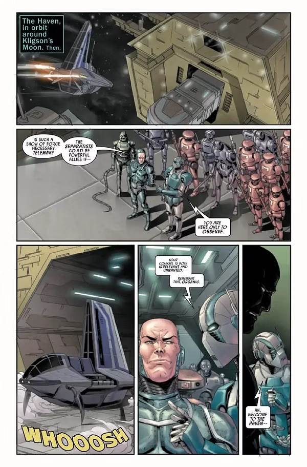 Bounty Hunters #38 begins with a flashback to the Clone Wars era on Kligson’s Moon, the home of Ajax Prime’s colony (called “The Haven") of free-thinking droids. There Telemak– the leader in Ajax’s absence– and Tar Kligson– heir to the namesake of the moon– greet General Grievous, who has come seeking more droids to add to his Separatist army. Telemak refuses, reinforcing the liberty of his fellow droids, which causes Grievous to attack. Then writer Ethan Sacks cuts back to the “present" (the period set between the events of The Empire Strikes Back and Return of the Jedi) at the same location, where T’onga’s crew is getting fed up with waiting for Kligson to complete his repairs on the cyborg bounty hunter Beilert Valance. We then see that Kligson has Valance almost crucified in his laboratory and is controlling the words and actions of Telemak remotely. Meanwhile, Zuckuss and 4-LOM are sneaking around the back hallways of the Haven trying to find “fellow droids" to get intel from, but they are soon ambushed by the Scourge’s spider droids– not to mention the rest of the droids there that have already been possessed by the Scourge virus. In a hail-Mary maneuver, Zuckuss shoves his droid partner into an escape pod, sending 4-LOM out into space, which causes the evil droids to completely lose interest in the Gand.