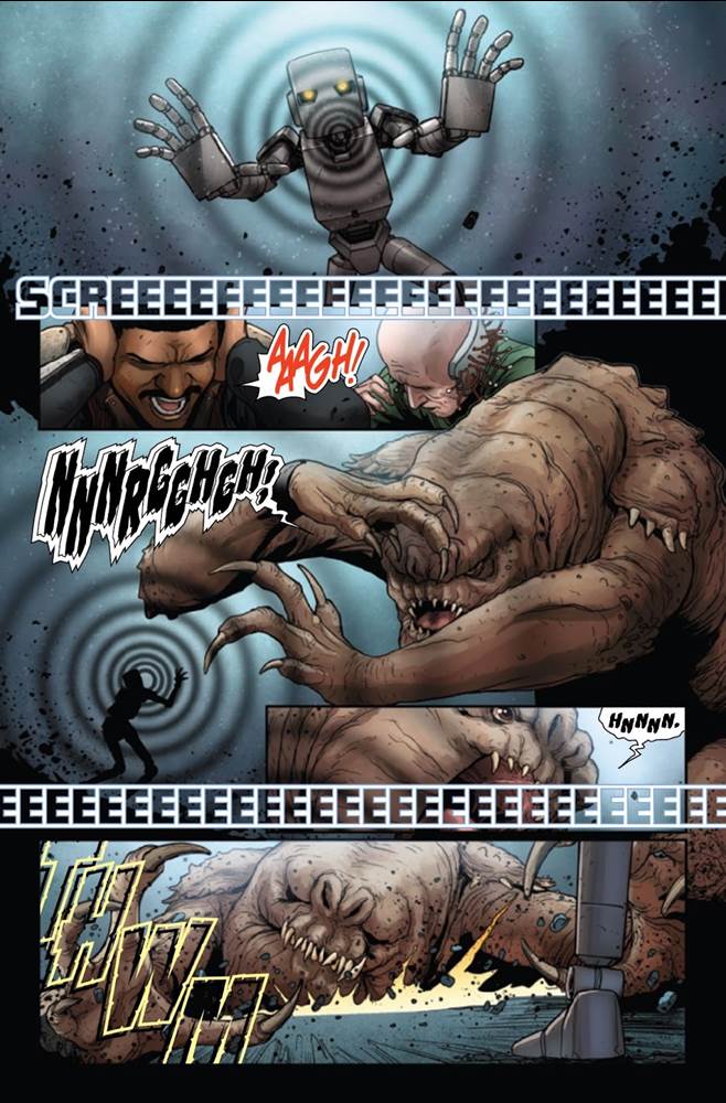 Lando makes an excuse as to why he and Lobot can’t just unfreeze Han that very moment, and I’m not sure I buy it, considering the circumstances aren’t too much safer later on during the events of Return of the Jedi. But regardless, they leave Han behind and make their way out through secret tunnels provided by Talky, only to be overtaken by the Dark Droids once again. This time they’re not moving fast enough and Lobot gets abducted by the Scourge, with the intent of using the cyborg as a means to transfer its conscience from the “metal" into the “meat." There’s another great moment of body-horror that carries over from the main Star Wars: Dark Droids miniseries, and Lando fails to retrieve Lobot as he and the Talky escape to the Millennium Falcon. We also get a quick flashback to a better time with Lobot and Lando on a heist to a lush tropical planet, and the issue ends on a somewhat hopeful note, with Lando vowing to rescue his friend.