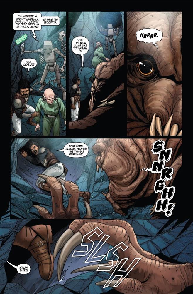 Star Wars #39 begins where the previous issue left off, with poor Lando Calrissian and his cyborg pal Lobot trapped between a rock and a hard place– that is, between a bloodthirsty Rancor and a gaggle of droids possessed by the evil A.I. known as the Scourge– in Jabba’s Palace on the planet Tatooine. Thankfully, the non-possessed droid they came to extract from the palace (we’ll call him Talky) knows how to temporarily incapacitate the Rancor, and the trio are able to climb up to relative safety in Jabba’s throne room. “But where is the mighty Hutt?" you may ask. He’s out surfing the Dune Sea in his Sail Barge with the rest of his menagerie, and when he learns that these “Dark Droids" have overrun his palace, he orders his goons to eliminate everything that moves once they’ve returned– except the Rancor, that is, at keeper Malakili’s insistence. So though the Talky droid urges Lando and Lobot to hustle on out of the palace, Lando wants to take a moment to apologize to his frenemy Han Solo, who still hangs on the wall, frozen in carbonite as Jabba’s prized possession.