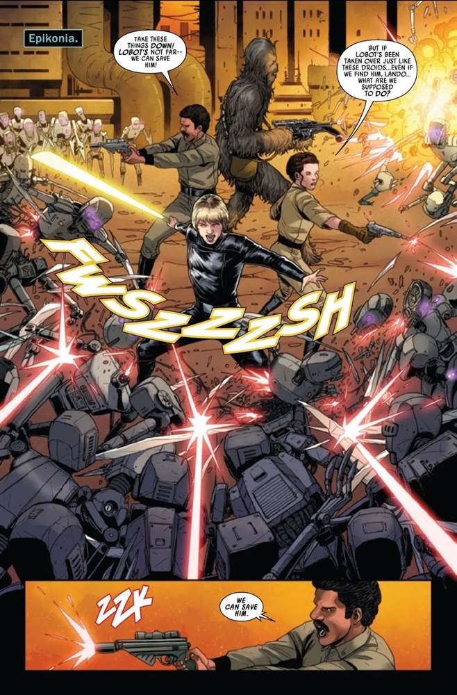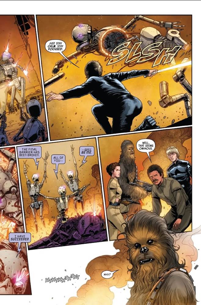But get out of it they do, and the next step is to get Lobot back aboard the Millennium Falcon. In the meantime, Luke and Leia decide to stay behind on Epikonia to help the Scourge survivors, while Chewie helps Lando carry his pal to the ship. There, Lando warns the Wookiee that what he’s about to see will be damaging to Calrissian’s reputation among the Rebel Alliance, and then he reveals the stolen ancient “Talky" droid hidden in one of the Falcon’s compartments. Lando demands that the Talky repair Lobot’s cybernetic implants under the threat of an eternity of the droid equivalent of pain. That’s when Leia and Luke walk in, having discovered that there wasn’t much they could do to help on the planet– and, as good people, being concerned about Lobot. And this is where the Talky uses fairly impenetrable logic to deduce that Lando must confess his crimes against the Rebellion to Luke and Leia before the droid will be willing to save Lobot’s life.
