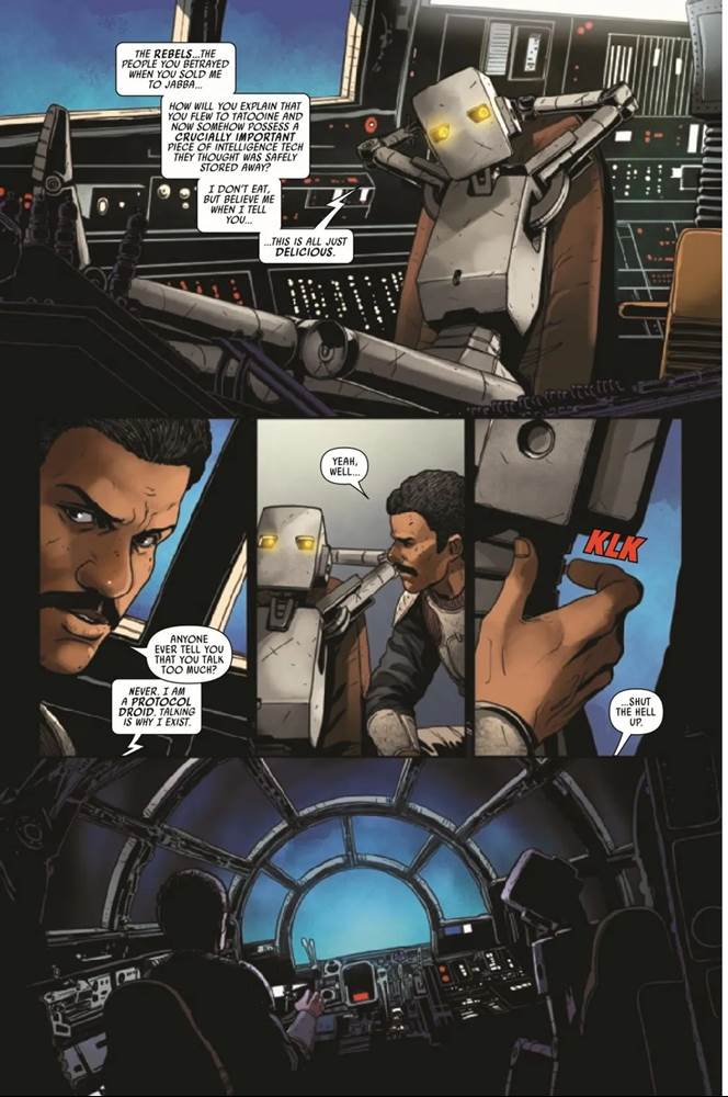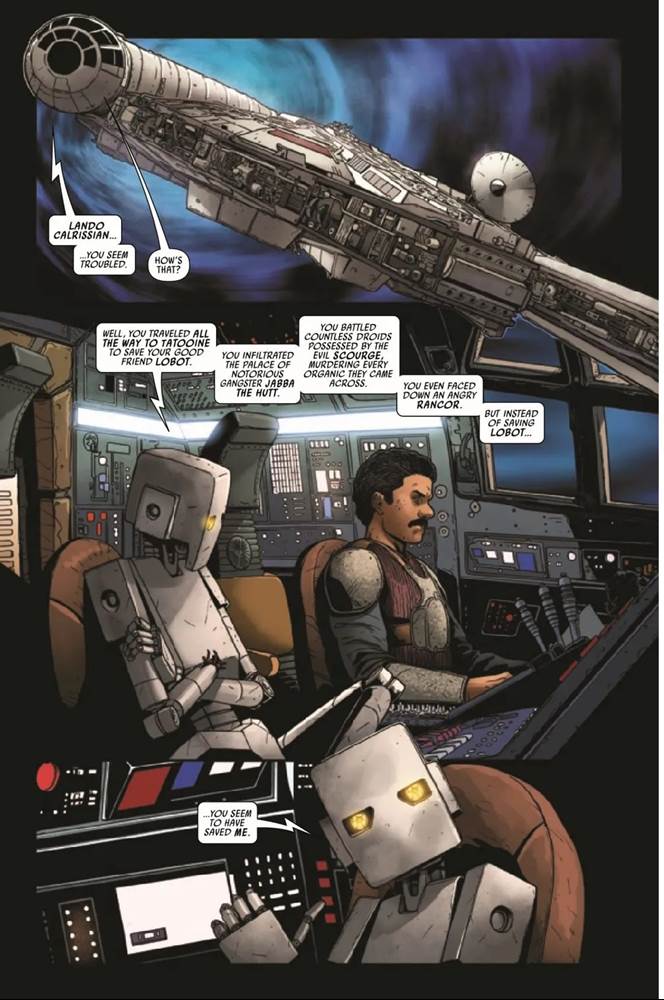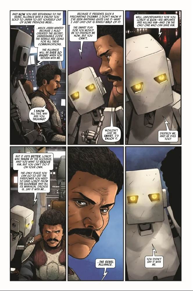 Star Wars #40 picks up immediately from where the previous issue left off, with Lando Calrissian and the ancient “Talky" droid drifting through space in the Millennium Falcon, but the always-reliable writer Charles Soule amusingly uses the gap between chapters as an opportunity to recap the recent storyline via the Talky. Lando is hilariously frustrated by this expository dialogue, but he does work through his options with the droid, considering he has to return to the Rebel Alliance to ask for help, bringing stolen property with him. We’re then treated to another flashback to Lando and Lobot’s younger days, and a moment when the cyborg marvels at Calrissian’s ability to weave complex untruths to everyone he interacts with. But Lando then vows that he’ll always be honest with Lobot, and we cut back to the “present" (the period set between the events of The Empire Strikes Back and Return of the Jedi), with Lando arriving at the rebel flagship Home One.