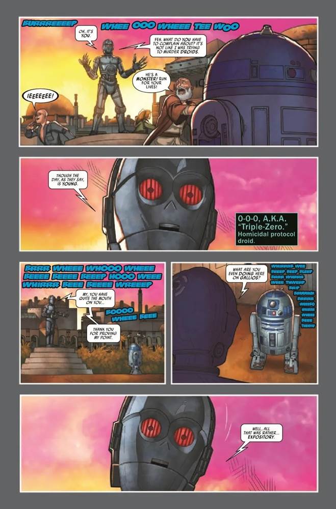 Dark Droids - D-Squad #2 begins on the planet Gallios, where R2-D2 has pursued rumors of a murderous protocol droid, believing it to be his companion C-3PO, who has recently become infected with the virus-like consciousness of the evil artificial intelligence known as the Scourge. But instead of his golden friend, Artoo finds the other evil protocol droid we know about– Triple-Zero (introduced way back in the 2015 Star Wars: Darth Vader comic series– who has not been possessed by the Scourge, but is still uncontrollably murderous all the same. So it turns out that Triple-Zero’s counterpart BT-1 has also been corrupted much like C-3PO, so Artoo and Trip are forced to form an uneasy alliance in the interest of bringing both of their trusty companions back to their usual selves. This process begins by tracking down BT-1 on Gallios, which as Trip suggests is simply a matter of following the screams.