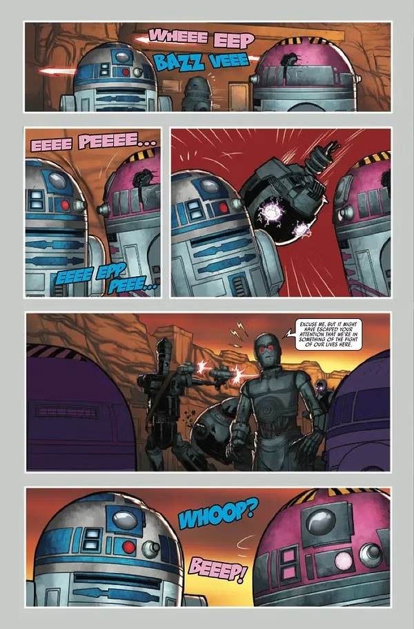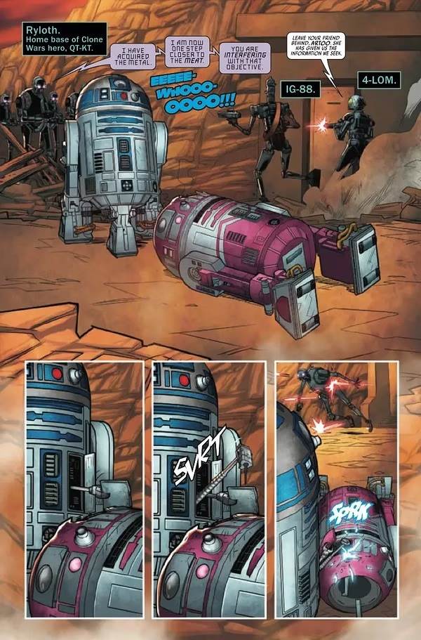 Dark Droids - D-Squad #4 picks up where the previous issue left off: with our favorite astromech droid R2-D2 and his unlikely robotic allies on the planet Ryloth, where they recently met up with Artoo’s old friend from the Clone Wars, QT-KT. QT has been blasted unconscious by a squad of KX-series Imperial security droids and their Dark Trooper companions, but Artoo works quickly to repair her while the others do their best to fight their enemies. And once everyone on the D-Squad is back in action, they are able to swiftly mop the floor with the invading forces, resolving to continue on their way once the explosive battle is over. Next they travel to Tatooine, where they believe Jabba the Hutt holds information on the whereabouts of the droid revolutionary Ajax Sigma, who may very well be the key to defeating the Scourge virus that is plaguing droids around the galaxy.