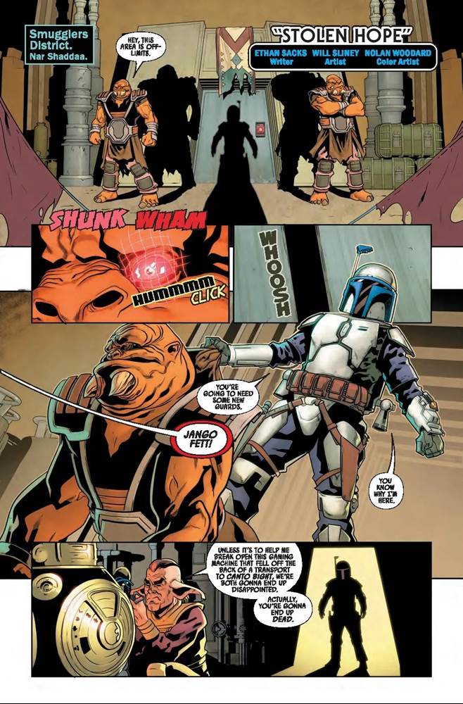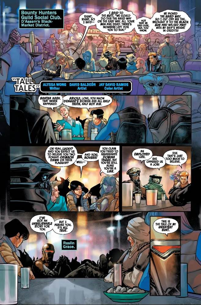 The second story also involves Dengar, and takes place at the Bounty Hunters Guild Social Club on the planet D’Assem. There, another hunter named Raslin Grace (also newly introduced here) relates a tale about a bounty gone wrong, and nobody else present seems to believe her– even we, the readers, are tipped off that some of the details may have been fabricated. This slightly longer adventure by Allyssa Wong will apparently lead into the pages of her comic Doctor Aphra, though that’s scheduled to end next month, so I have to wonder just how large a part Raslin will play. For the third story, writer Ethan Sacks (Star Wars: Bounty Hunters) takes us back to the prequel era for a quick, exciting caper with Jango Fett. There’s a cameo appearance by Aurra Sing at the end pointing us toward Marvel’s Star Wars: Jango Fett miniseries, due to begin in March. And next we get a preview of the Star Wars: Mace Windu miniseries by Marc Bernardin (Star Wars: Darth Vader - Black, White & Red), sending the Jedi Master to shut down the illegal trade of “skeleton keys" that can open any door in the galaxy. It’s fine as these things go, but I can’t say I’m personally all that thrilled that Marvel is shutting down ongoing titles set during the Original Trilogy to focus more on characters from the prequels.