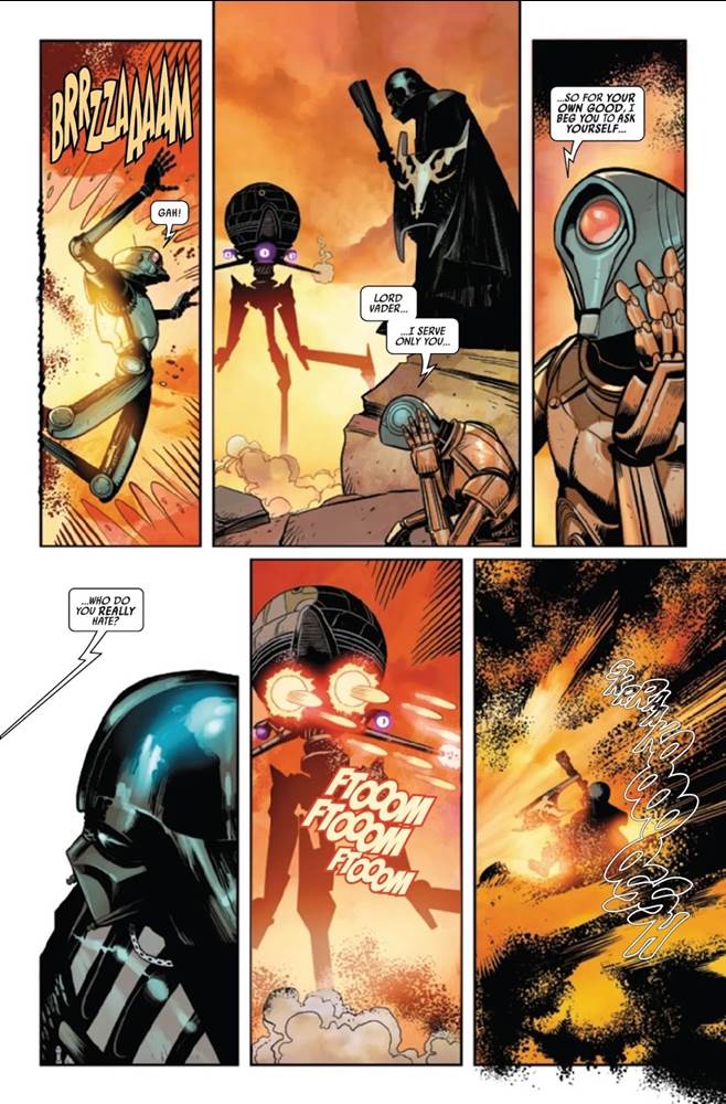Has there been some sort of edict at Marvel Comics that the ongoing Star Wars titles (which are currently set between the events of The Empire Strikes Back and Return of the Jedi) need to incorporate more prequel-era characters and iconography? I guess it wouldn’t surprise me too much, as the generation that grew up on the prequels are now full-fledged adults who embrace those movies far more than I likely ever will. Either way, prequel fans will be pleased to pick up recent issues of Star Wars: Bounty Hunters or Star Wars: Darth Vader, the latter of which features a battle between the Dark Lord of the Sith and an Octuptarra tri-droid (first seen in Episode III: Revenge of the Sith) in this month’s issue. Darth Vader #39 begins on the planet Mustafar– another prequel-introduced location– where the title character has just cut down an army of Scourge-possessed droids… by the way, this is a tie-in with the Star Wars: Dark Droids crossover event that’s going on right now. And the few droids that remain on Vader’s side are searching for their compatriot Zed, who unbeknownst to them has also been taken over by the evil A.I. known as the Scourge. Soon Zed shows up and reveals his true corrupted nature, unleashing the Octuptarra droid on Vader and his allies.