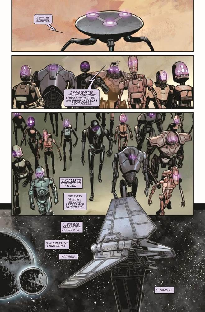 Anyway, Emperor Palpatine’s forces are closing in on Vader after the latter attacked the former last issue, but Vader uses those mind-controlled droids to expand the reach of his Force powers in another really smart utilization of the Scourge’s abilities. And most of the rest of this issue is a big battle between Vader, the dozen-or-so droids under his control, and the droids and ships still under the Scourge’s broader control. While this is happening, there’s also a back-and-forth conversation between the captive portion of the Scourge’s persona and Vader’s defiant inner monologue. It’s a pretty terrific dialogue between the two, and I would go so far as to say it gave me more insight into the Scourge’s personality and desires than the rest of the Star Wars: Dark Droids crossover event has previously.