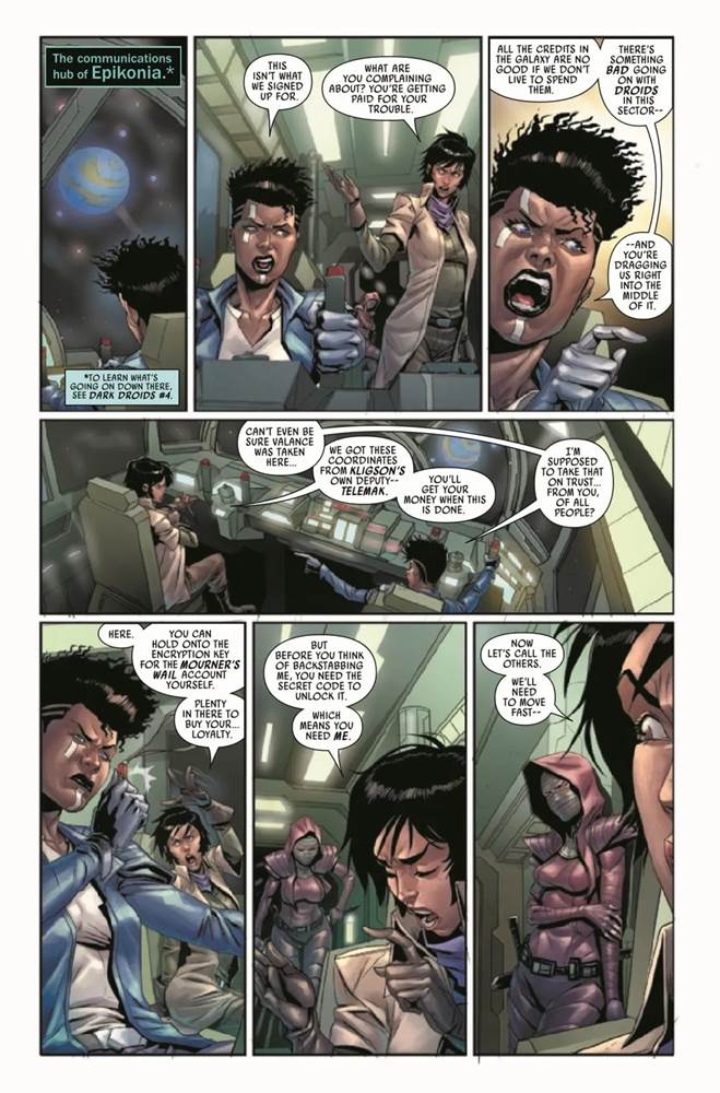 Arriving on the communications planet of Epikonia, the crew disembarks the ship and then the hulking Durge unleashes a sneak attack from behind on Zuckuss, kicking off a mutiny that Khel, Deathstick, and Bossk also participate in. Tanna gives T’onga a piece of her mind and then leaves her and Zuckuss for dead on Epikonia, where they are dragged away by a group of Scourge-possessed droids. Meanwhile in Imperial space, we see that Lieutenant Jyala Haydenn has copied all of her lover Valance’s memories onto a data stick, though her subterfuge is quickly discovered by another Imperial officer who threatens to report her to Darth Vader. A knock-down, drag-out fight breaks out between Haydenn and this officer, ending with Jyala triumphant and sneaking off to escape the Empire. But on her way out to the shuttle bay, she witnesses Vader himself getting called off to the events of his own comic.