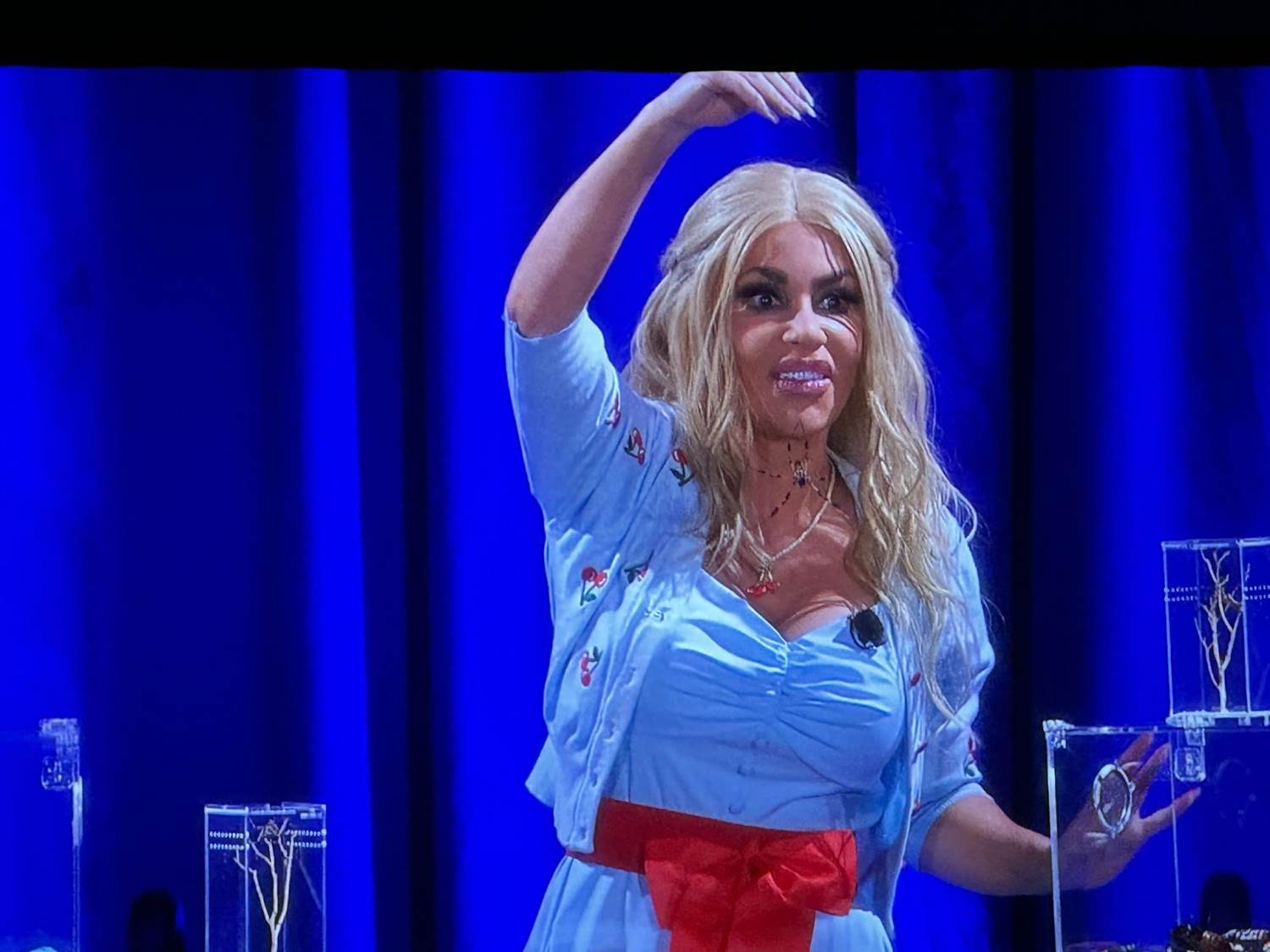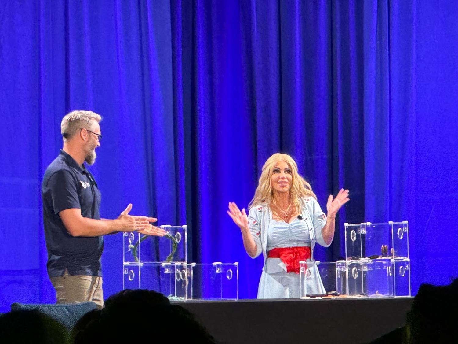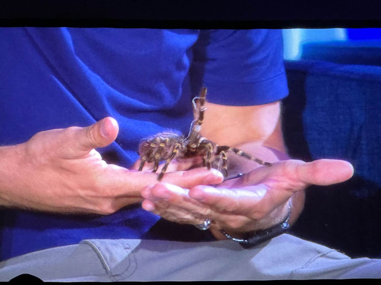 The audience was introduced to a Golden Silk Orb-Weaver spider, a large and striking arachnid known for its golden-colored silk, which is incredibly strong—strong enough to be used in sniper rifle crosshairs. This spider was featured in Hocus Pocus 2 and captivated the audience with its impressive web-spinning abilities.