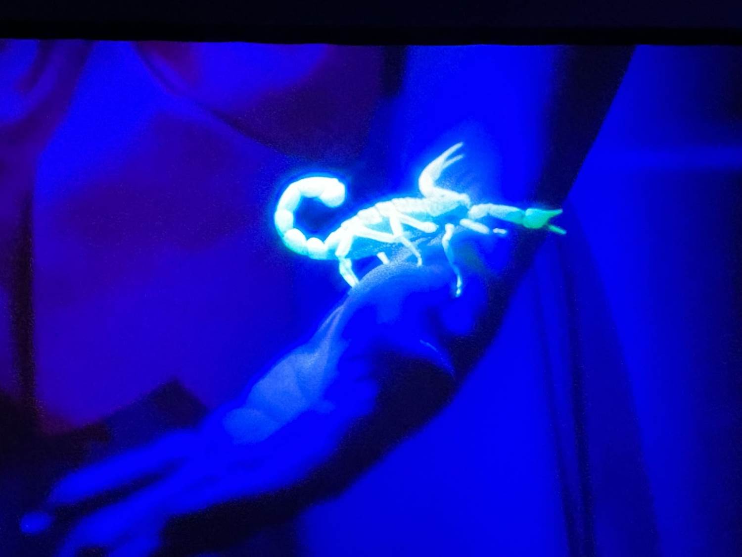 Dr. Zak Gezon demonstrated the unique bioluminescent properties of scorpions under ultraviolet light. This feature helps scorpions avoid predators during the day by ensuring they are fully hidden under rocks. The panel provided safety tips for those encountering scorpions in the wild, including using a black light to detect them at night.