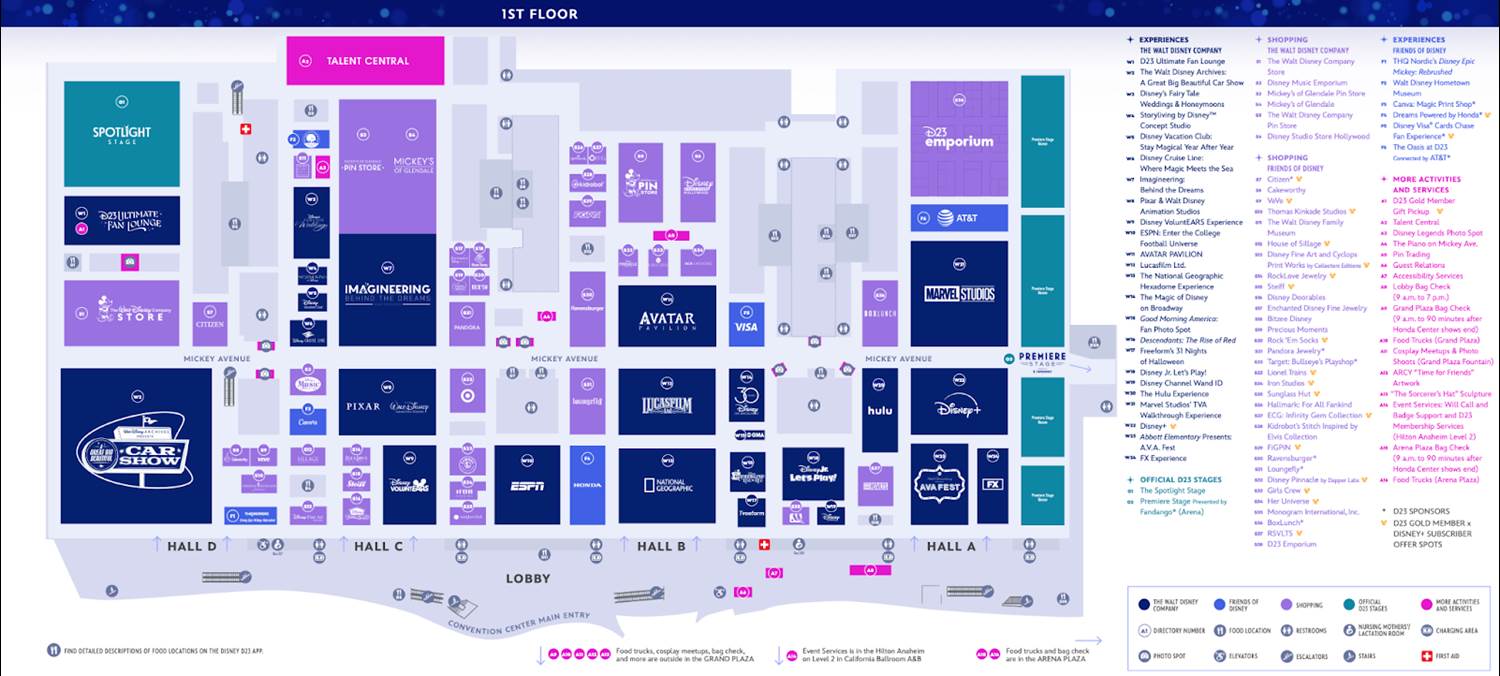 - Locations for booths and exhibits from Walt Disney Imagineering, Disney Experiences, the Walt Disney Archives and more can be found on the map.