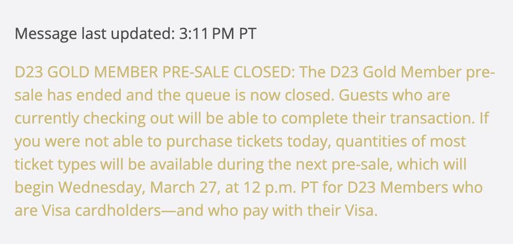 - As of 3:11 p.m. PT, the D23 Gold Member pre-sale has ended and the queue is now closed.