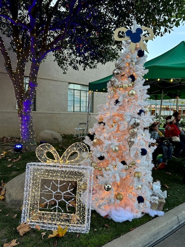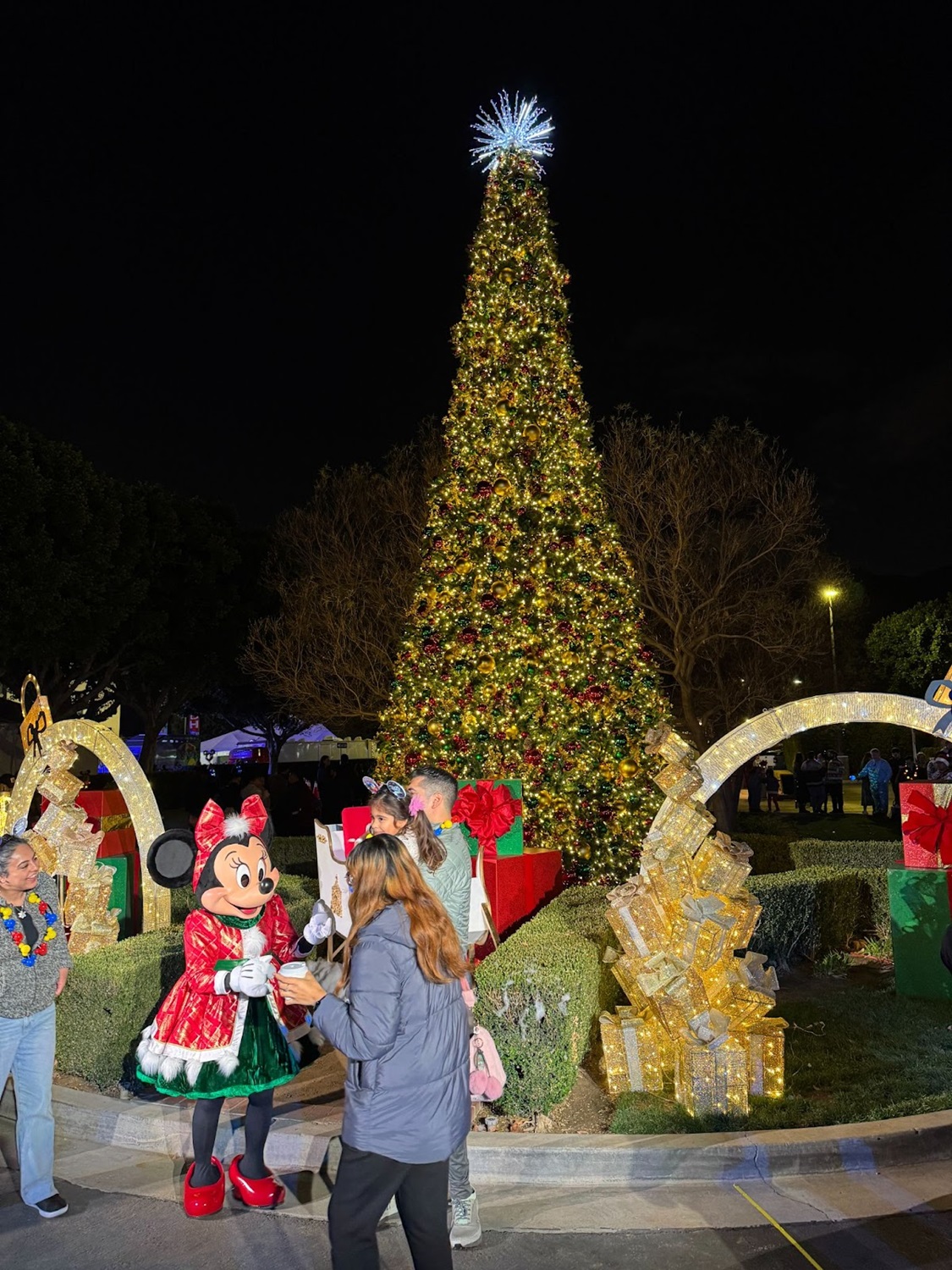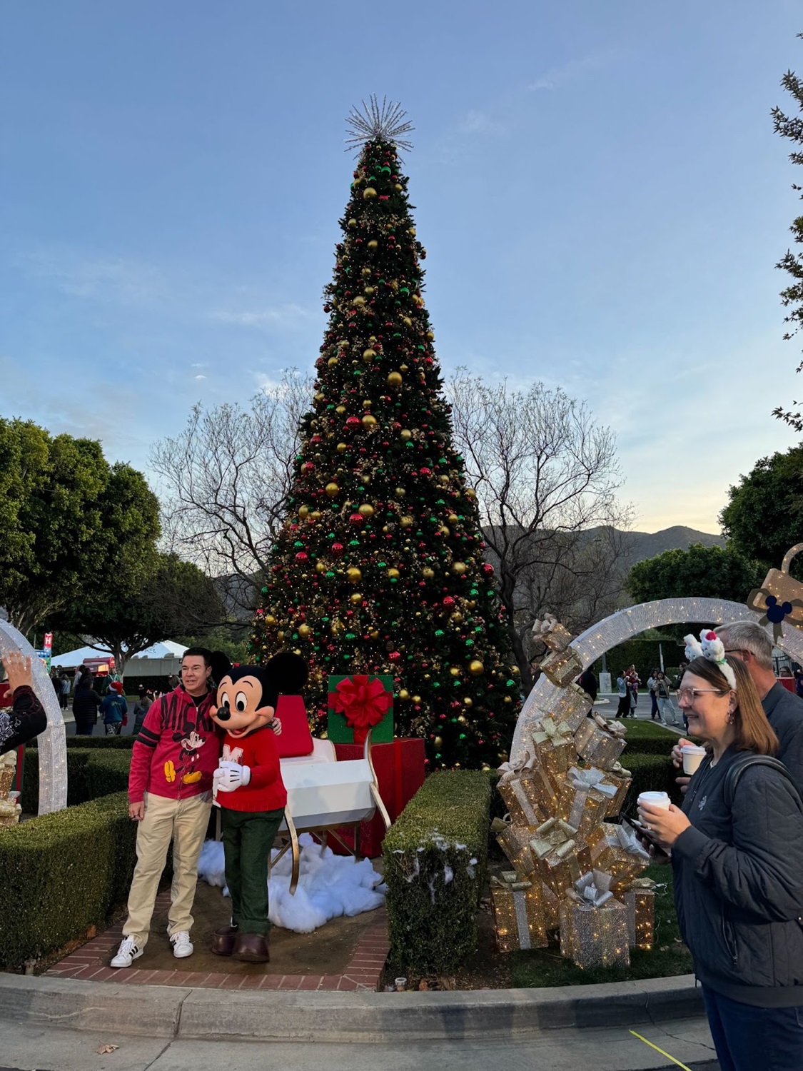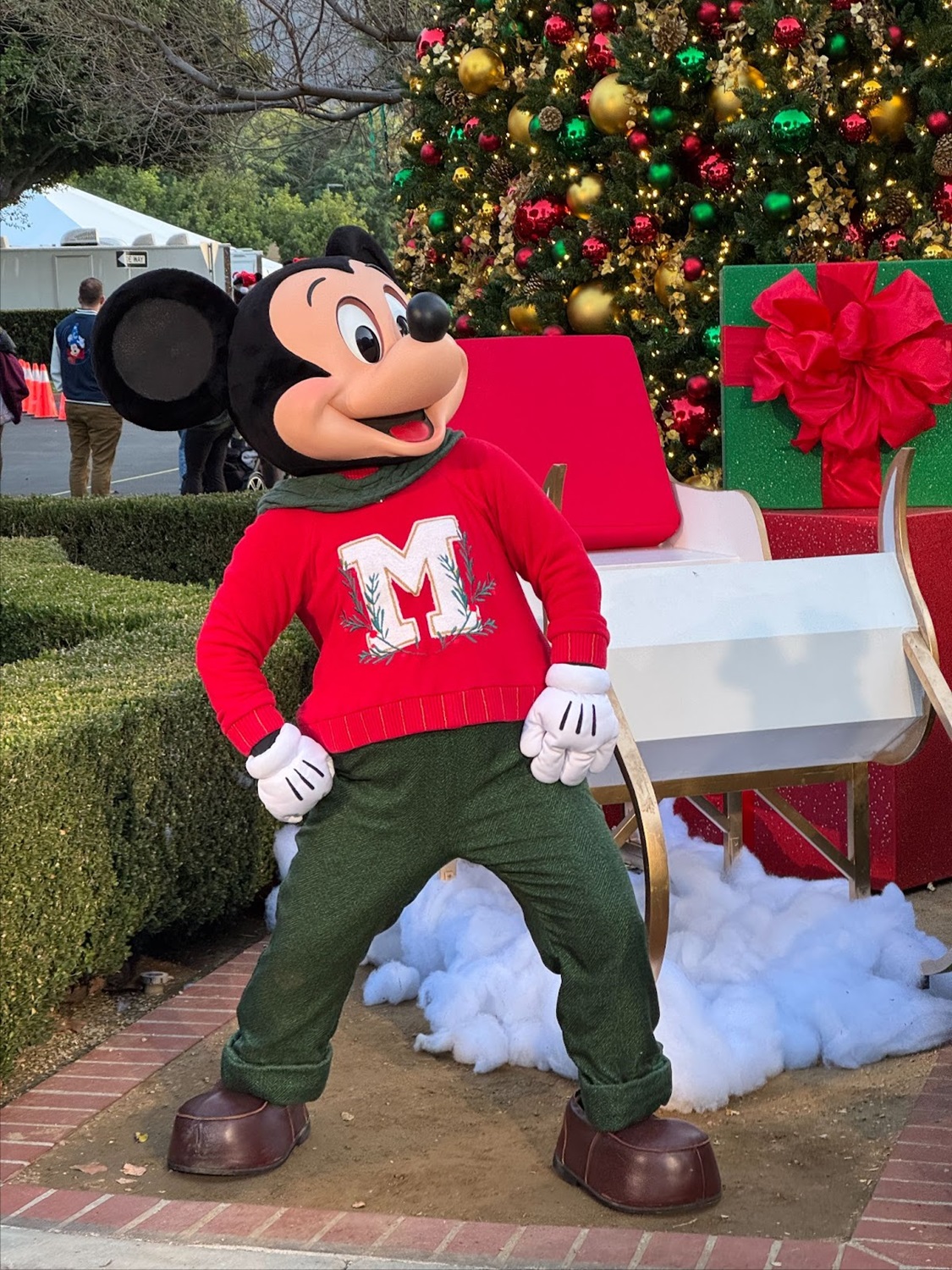 Mickey Mouse was camped out in front of the lot’s Christmas tree, also decorated quite nicely.