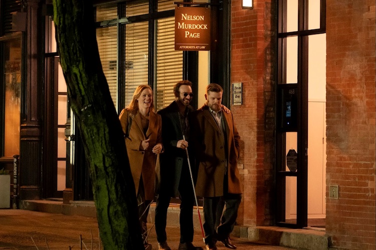 The episode opens with Matt, Foggy Nelson and Karen Page stepping out of their office. The third season of Daredevil ended with them forming the three-person legal team of Murdock, Nelson and Page. They head to Josie’s Bar, their usual watering hole, for an apparent retirement party for a police officer named Cherry.