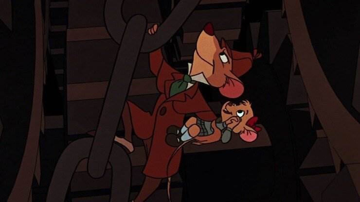 In the final moments of The Great Mouse Detective, Basil is caught in the big hero vs. villain moment of the film, as he takes on Ratigan in the inner workings of Big Ben.