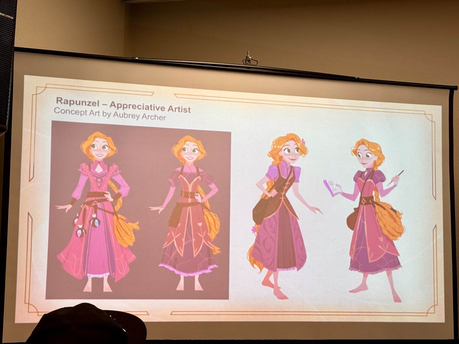 Aubrey Archer explored Sapphire’s intellectual and curious qualities in Rapunzel - Appreciative Artist (from Ursula’s Return). This design shows Rapunzel sketching in a magical forest, emphasizing her inquisitiveness. Sapphire’s shape language of repeating, geometric forms is present in Rapunzel’s dress and the forest’s succulents and flowers, giving her a structured yet organic look that mirrors her personality. Aubrey showcased the evolution of the concept during the event. A close composition captures Rapunzel’s focus on the natural world, while her long hair adds movement and frames the scene.