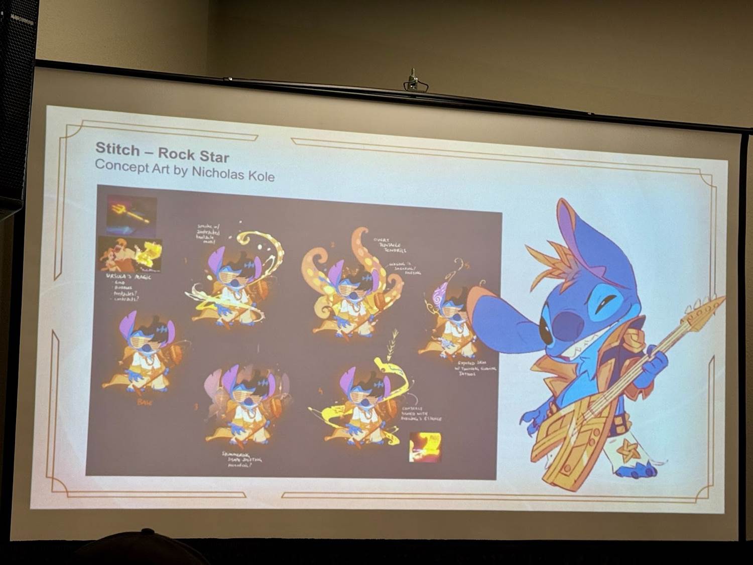 Kole’s Stitch - Rock Star card showcases Stitch’s rockstar energy while incorporating Amber’s group-focused, woven motifs. The artwork was originally intended for packaging, but eventually it was decided that this version of Stitch would be a prize card at Lorcana championship events. The pose and styling were developed to keep Stitch recognizable and dynamic. Elements from Stitch’s “rockstar" personality, like an Elvis-inspired look, were reinterpreted to fit Amber’s teamwork traits, with braided details in his costume and hair. For the Championship prize card, Kole added sparkly effects to heighten the magical feel, making it a fan-favorite in full foil.