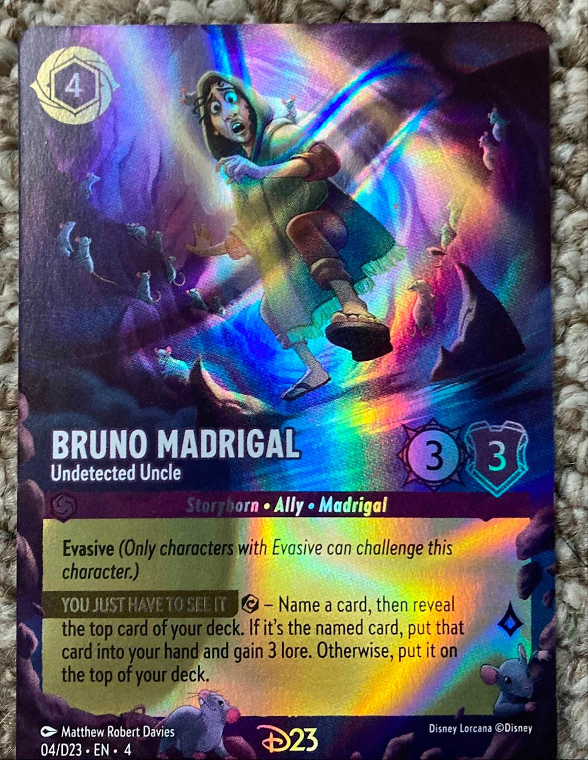 Disney Lorcana has shared that fans who got the Bruno Madrigal - Undetected Uncle card as part of the D23 Collection are now holding a rare misprint, with the wrong artist credited for the illustration featured on the card.