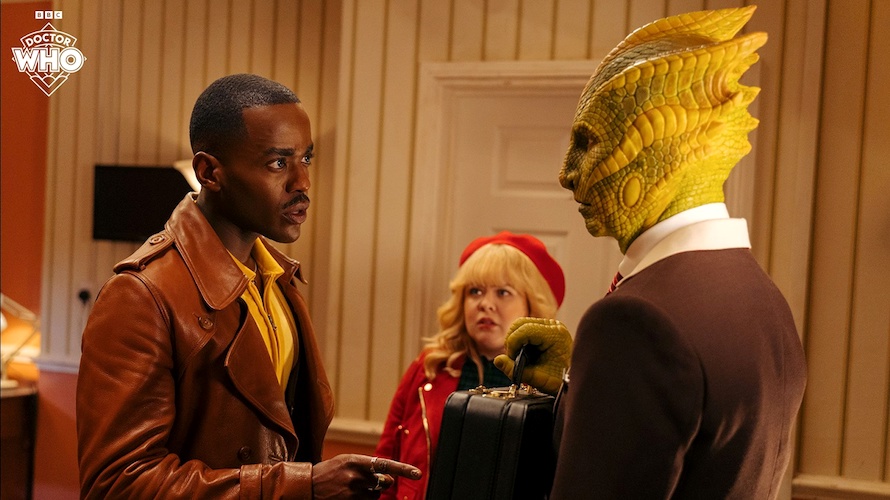 - The Doctor is wearing the fantastic coat that he appeared in during last year’s Christmas special, “The Church on Ruby Road." We also get to see the two meeting with a Silurian, who first popped up in a preview for the episode revealed earlier this year at San Diego Comic-Con.