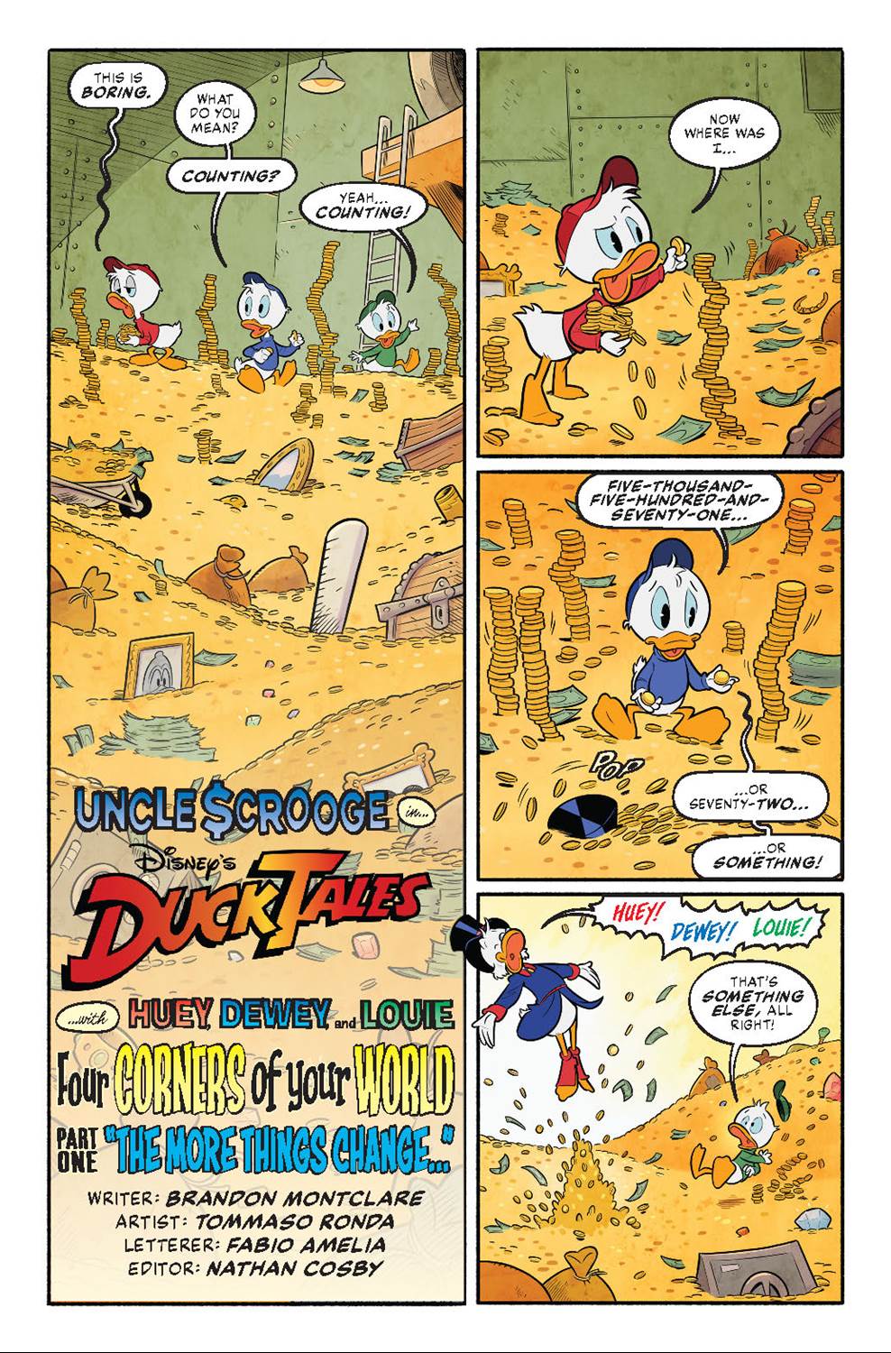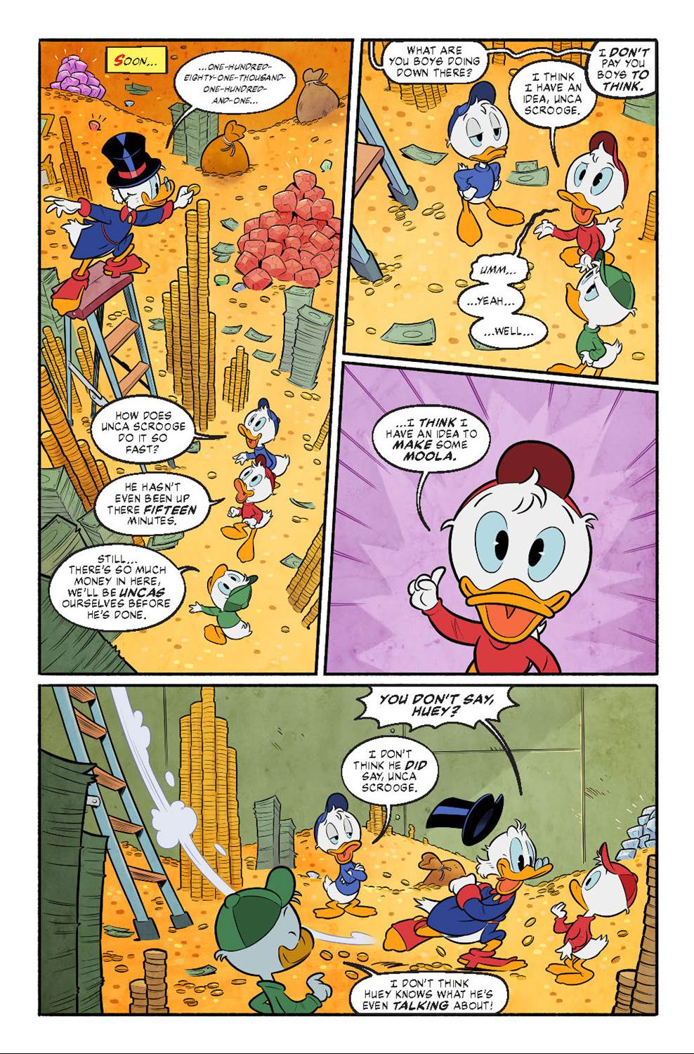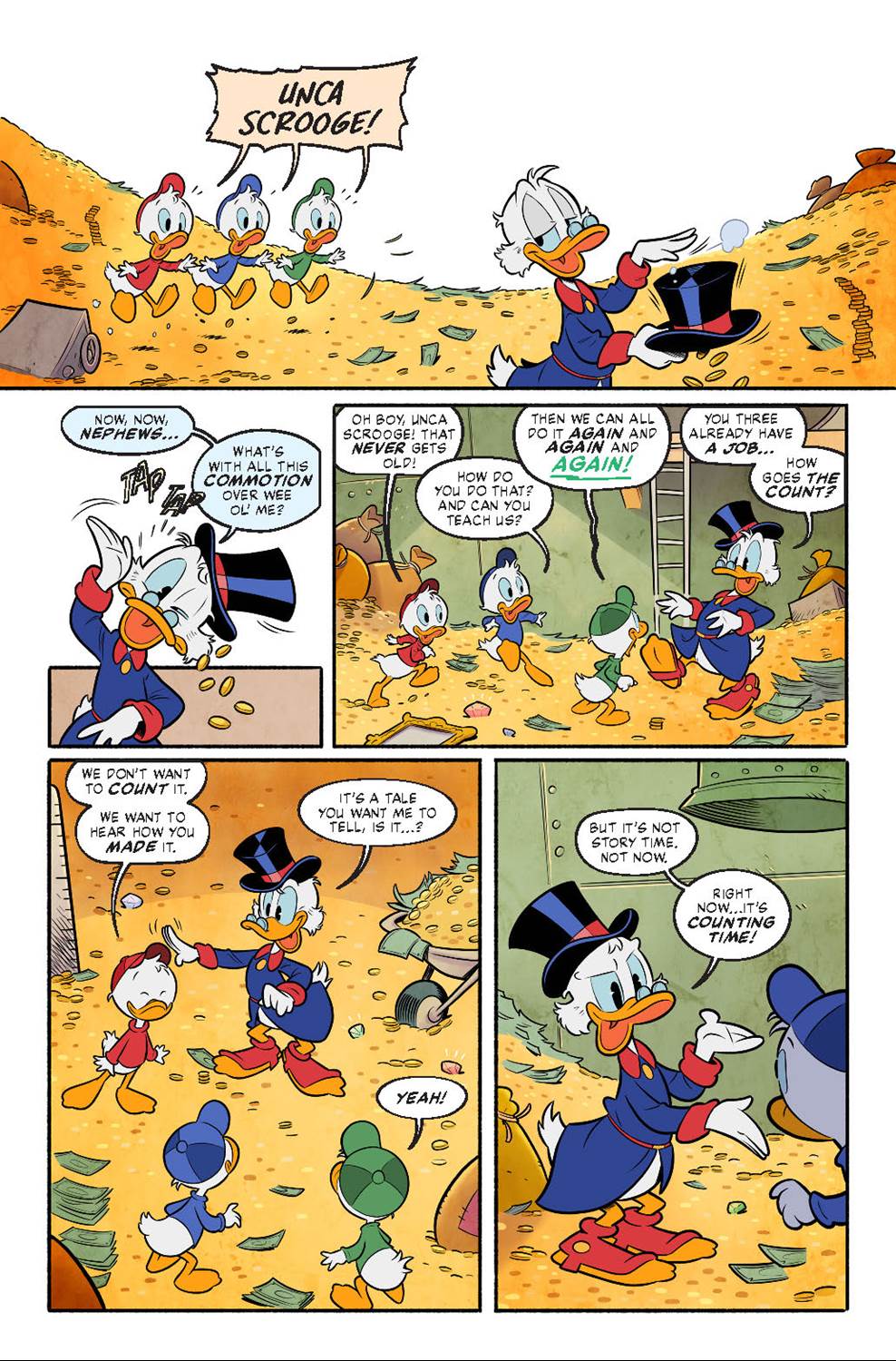 The character of Uncle Scrooge McDuck got his start in Disney-licensed comic books by Carl Barks way back in 1947, so it makes perfect sense to continue his adventures via a new comic series that launched today. This iteration, published by Dynamite, is entitled simply DuckTales, and is indeed heavily inspired by the 1980s cartoon series of the same name– omitting the more recent reboot version of the show. Here, Uncle Scrooge dresses in his blue housecoat and pals around with nephews Huey, Dewey, and Louie… as issue #1 starts off with these poor triplets counting the coins in Scrooge’s infamous Money Bin. That’s when Scrooge pops up out of his fortune and the nephews demand to know how he swims around in it, so we realize that this comic takes place at a point in the timeline when they don’t know much about their eccentric “quadzillionaire" uncle just yet.