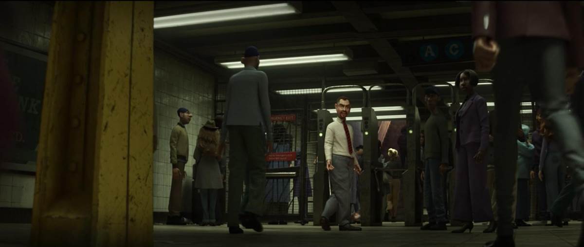 In a scene where Joe is running through the subway, after going through the turnstiles, he runs into/past a man wearing white business shirt and red tie, who turns and watches him. This character was confirmed to be a likeness created of John Ratzenberger, to keep his streak of continued Pixar appearances alive.
