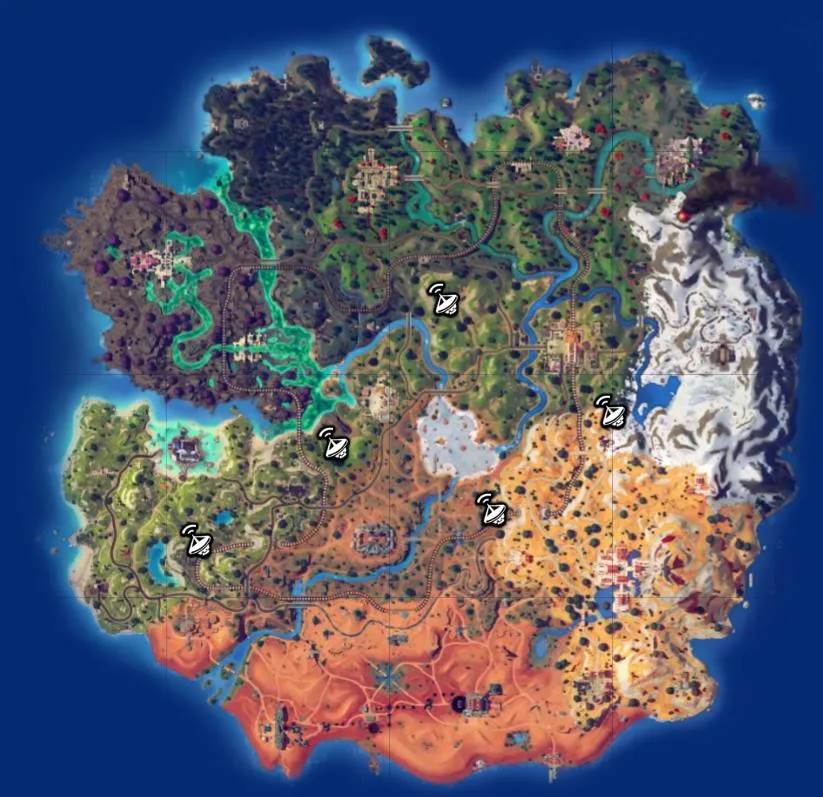 - Use a Forecast Tower – This challenge isn’t difficult, but it does require some planning. After the second storm circle closes in, Forecast Tower icons will begin appearing on the map. This indicates that they are ready to use. Only three will activate throughout a match, so staying close to one of them is a good idea. Once active, players will need to take down three bosses that rift in. Once they’re down, a keycard is dropped allowing players to head to the computer and activate the tower. Afterwards, players will have a map indicator showing where the next storm circle will be. You can view all five of the Forecast Tower locations below. You’ll then be prompted on your next challenge.