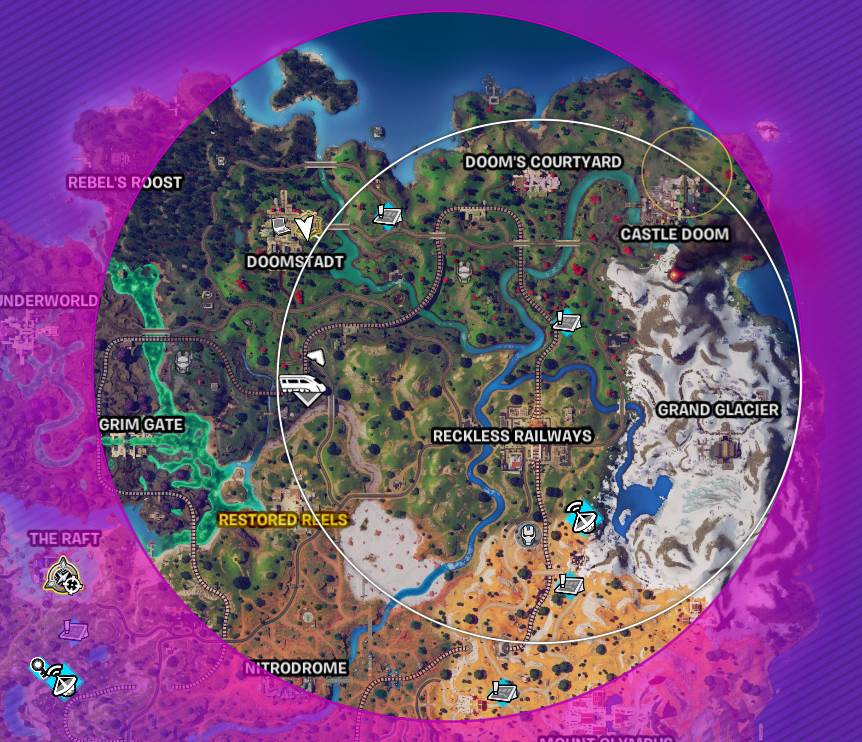 Now that we’ve got all our basics down, let’s talk about gameplay. The Battle Royale island will slowly be taken over by the storm during matches. The storm is a circular barrier that closes in periodically, forcing players into smaller regions of the map. In the upper right hand corner, the minimap will display a timer. When the timer indicator is white, it means the storm isn’t actively moving. When it’s purple, the storm will close in. The storm circle will show as a purple circle on the map, with a white circle indicating where the storm is closing to. You won’t need to guess where the storm is moving, so make sure you are paying attention to those circles to make sure you don’t get swallowed by the storm. If you end up in the storm, you’ll slowly start losing health. You will eventually be eliminated if you don’t escape the storm circle, but if you make it out alive, you’ll definitely wanna find some healing items.