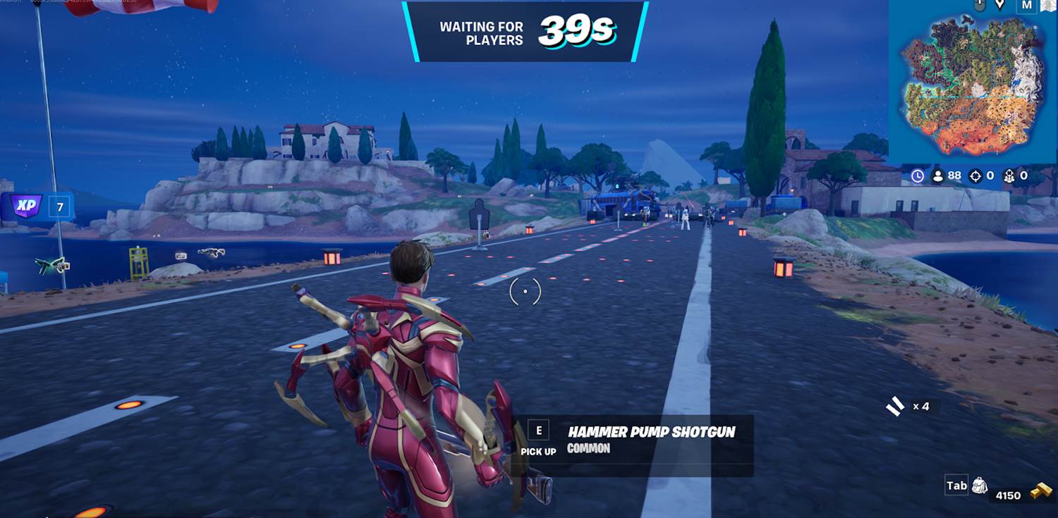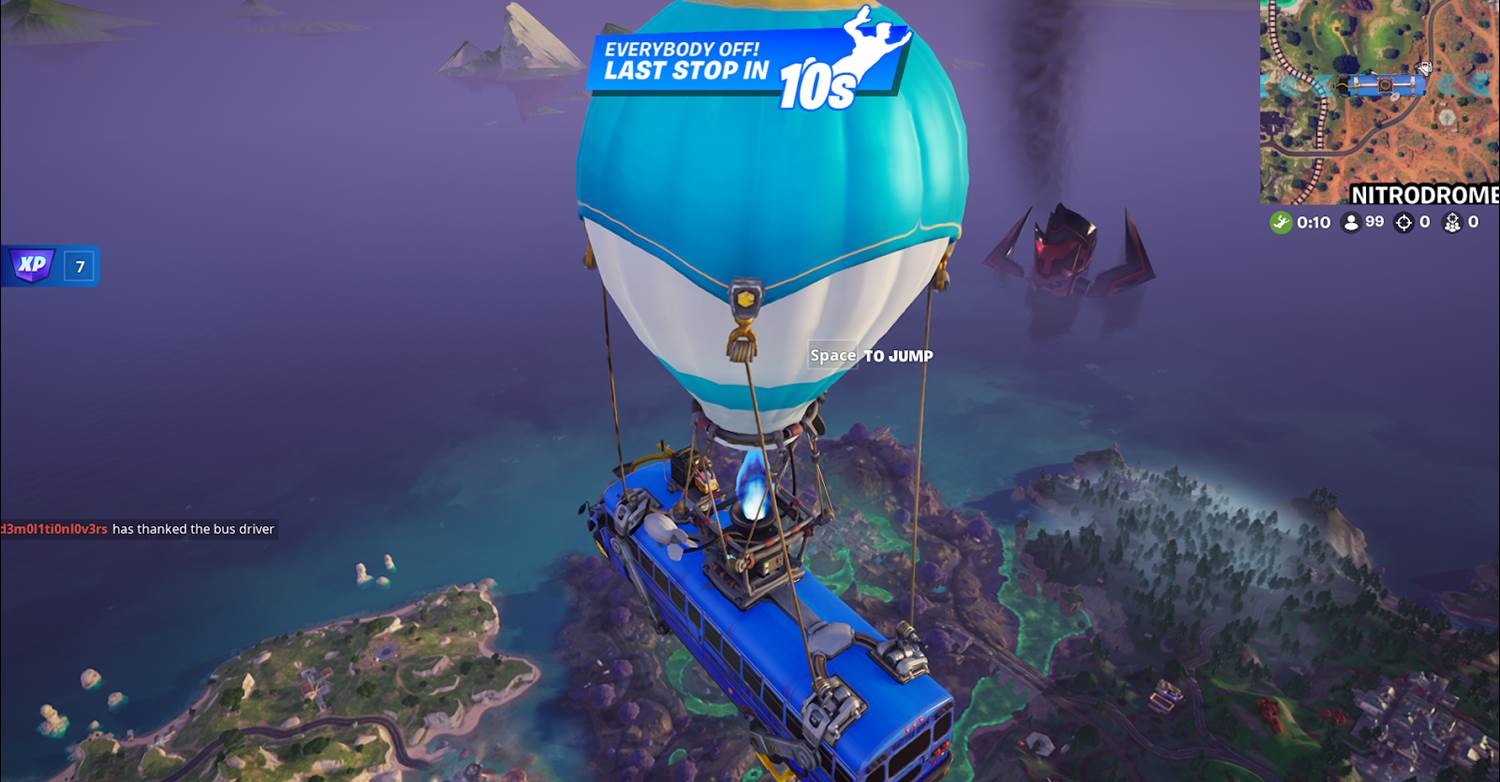 Once you click “Play," it won’t take long before you’ll begin loading into the Battle Royale lobby. Separate from the game’s map, players of the round will all start on a smaller island where you can run around, test weapons, emote, and wait for the Battle Bus to take off. Once the timer at the top of the screen runs out, you’ll board the Battle Bus automatically. This is where the game really begins.