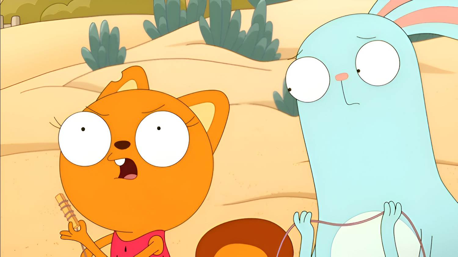 The volleyball rematch is on, and things are looking great for Baryl and Beverly, especially when Martin’s head pops up out of the ground (after his digging escape) and trips Dennis a la the original shoelace incident. This time, Baryl and Beverly are sure to wi—- oop. No they’re not. The net is starting to disappear string by string, as the seagull flies overhead with that last fry, with Kiff, Barry, and a lifeguard tower holding on for dear life. So that’s where Barry got the string.
