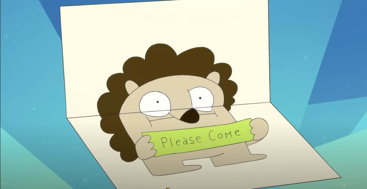 Upstairs, Scarm reveals his evil reasons for why he was trapped in the first place - he terrorizes halloween parties turning all the guests into decorations and eats all the candy - even guests dressed like candy. Barry and Kiff go outside so Barry can show her how brave he is now, all while Scarm turns everyone else into halloween decorations inside. Once they go back in, Scarm has left and made his way to downtown Table Town (after a catchy musical number), and Kiff and Barry figure out what happened. They must now revoke his party invite to send him back into the book. Too bad that when Barry gave him the invite, he ate it. Fortunately, as he eats all the candy and performs his magic, he is becoming larger in size, so Barry heads to town with Kiff and dresses himself like a giant piece of Candy Corn (Scarm’s favorite) to get eaten up by this new villain.