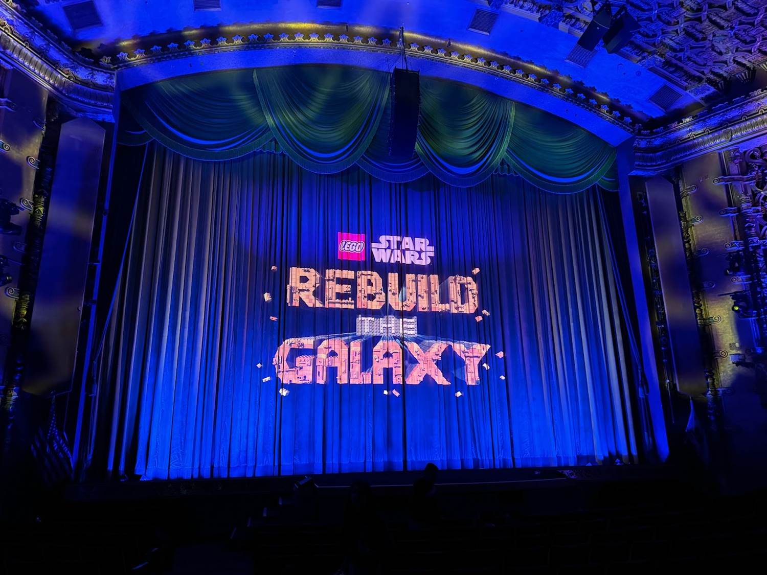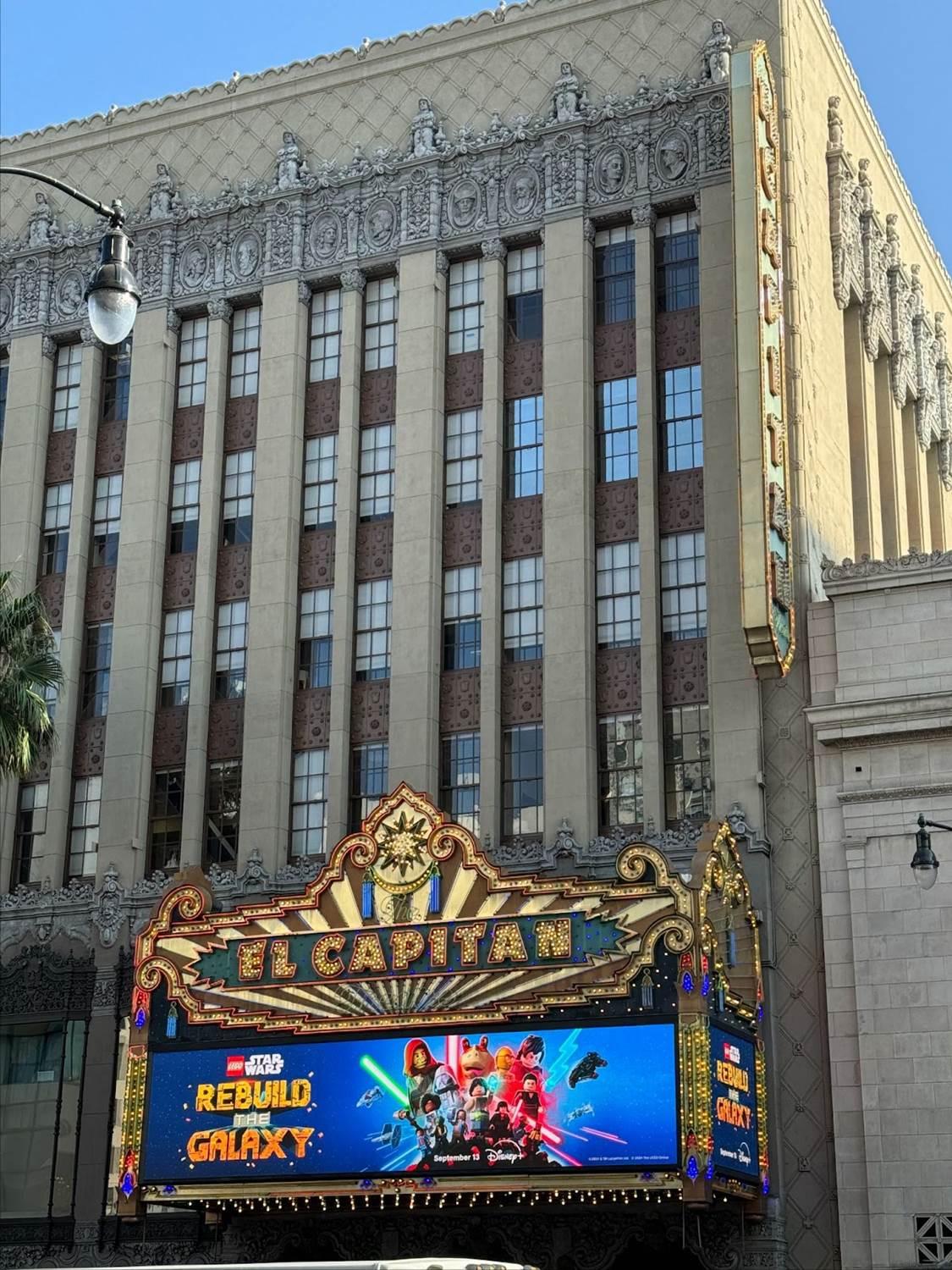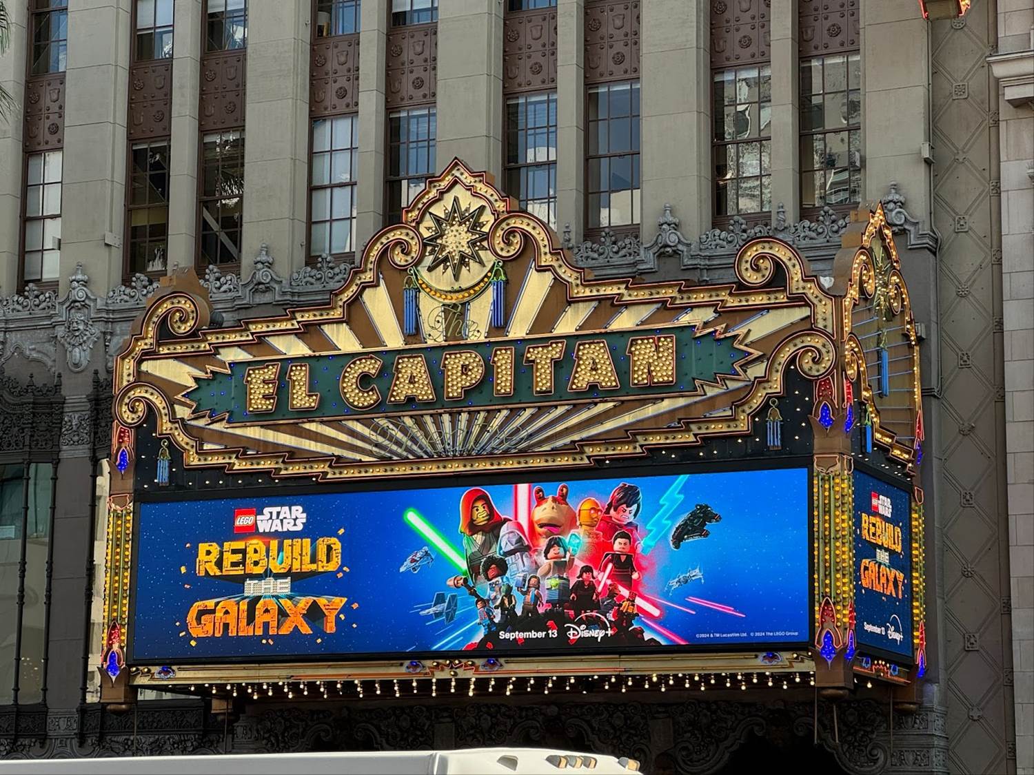 Rewinding time about an hour, when I first arrived at El Capitan on Hollywood Boulevard, I found the theater’s famous marquee illuminated with the LEGO Star Wars: Rebuild the Galaxy logo and key art. Then inside the lobby, there was a “Jedi Vader" photo op built out of– what else?-- LEGO.