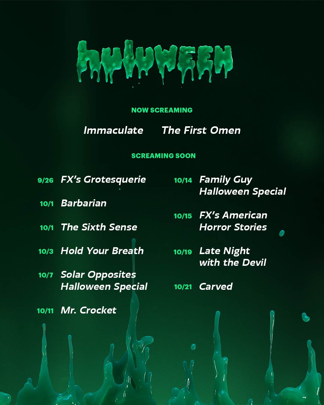 - Hulu is offering the debut of FX’s Grotesquerie, a brand new Halloween special from the animated series Solar Opposites and Family Guy, five new episodes from FX’s American Horror Stories, the final season of FX’s What We Do in the Shadows, and the second season of Reginald the Vampire.