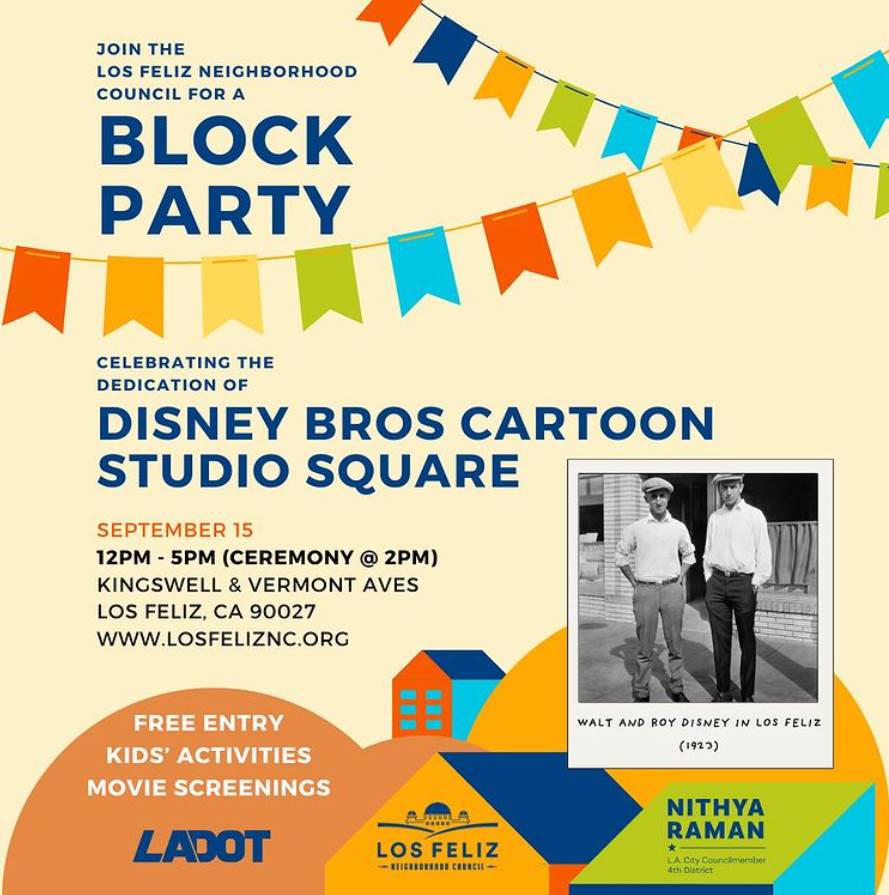 - The Los Feliz Neighborhood Council has announced on Instagram that they will be hosting a block party celebrating the dedication of Disney Bros Cartoon Studio Square.