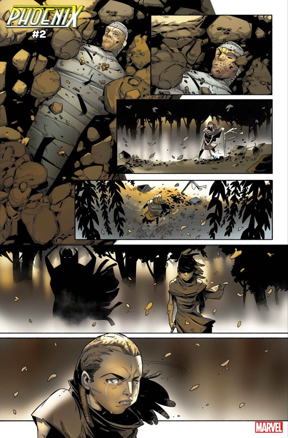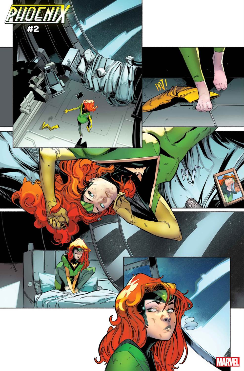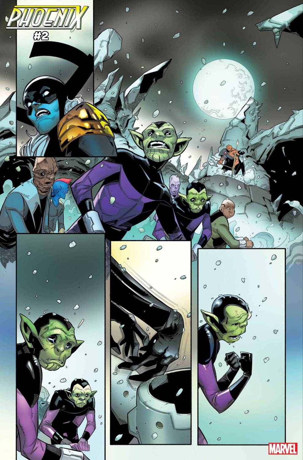 - A special first look at Phoenix' #2 finds Jean returning to her ship, exhausted, after a long day's work. In one page, she ignites as Phoenix, only for Corsair to darken her doorstep. In another, a young girl named Adani buries her father, as his killer Perrikus—the powerful villain who escaped the prison that Jean saved from a black hole—looks on. A final page shows two Skrulls looking up to see Thanos' Black Order lording over them.
