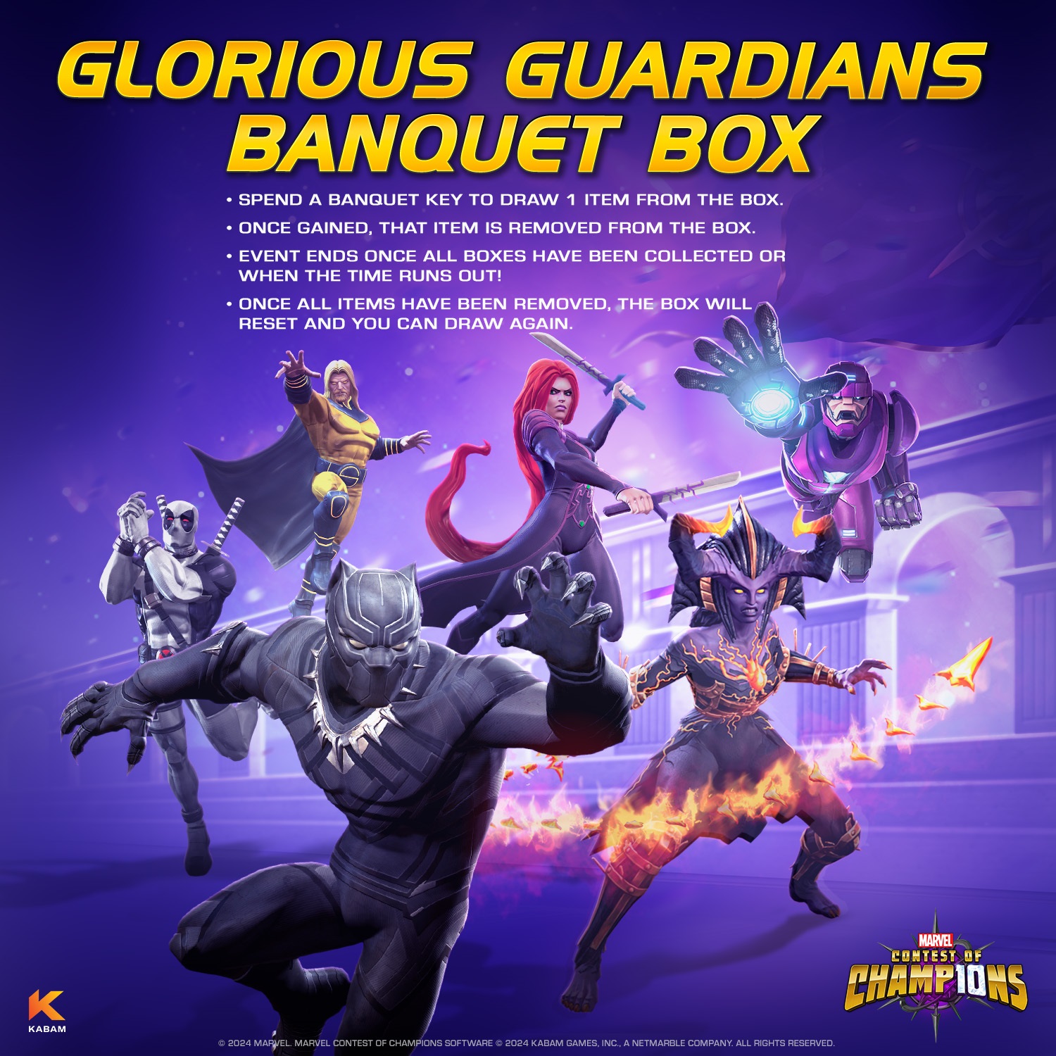 - This includes the Glorious Guardians Banquet Box, which will allow players to complete objectives for keys. Collect all six to receive Purgatory, Medusa, Black Panther (Civil War), Deadpool (X-Force), Sentry and Sentinel.
