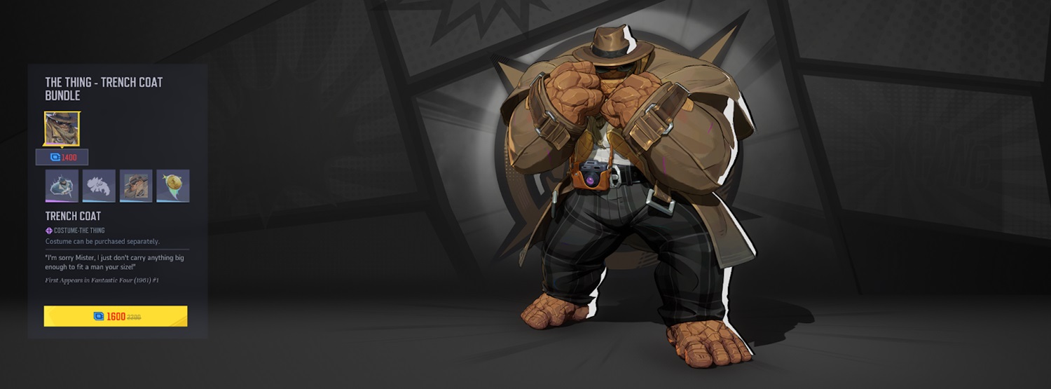 Also running for 1,600 Units, this costume is stylish and trendy, yet hilarious due to The Things sheer size and stature. I wonder what the shoulder measurements of that coat are? Again, this skin can be purchased separately for 1,400 Units, but doesn’t come with the emote, nameplate, or spray.