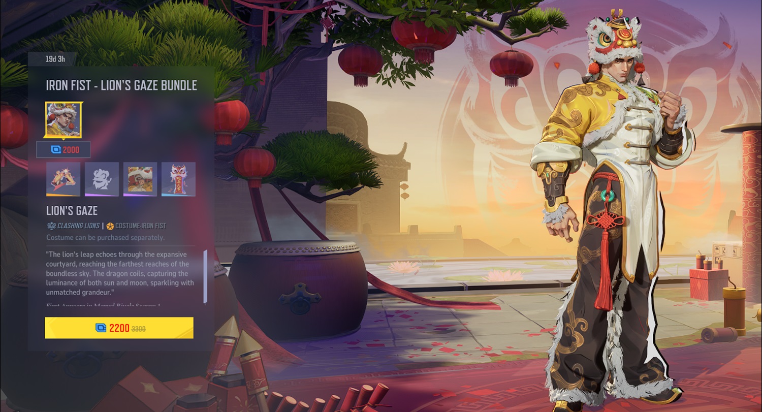 - Iron Fist’s Lion Gaze bundle will run you 2200 units (about $22), and includes the costume, a nameplate, an emote, a spray, and an MVP intro.