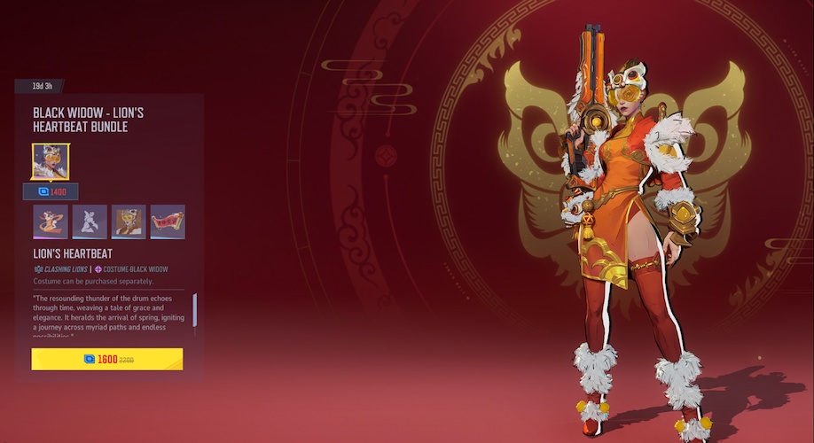 - For 1600 units (about $16), players can pick up Black Widow's Lion’s Heartbeat Bundle. This set also features a nameplate, emote, spray, and MVP intro.