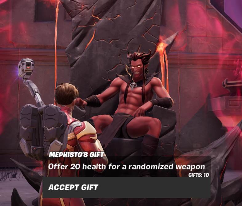 - He offers a sacrifice of 20 health for a randomized weapon as well as dialogue options about Cynthia Von Doom and Doctor Doom.