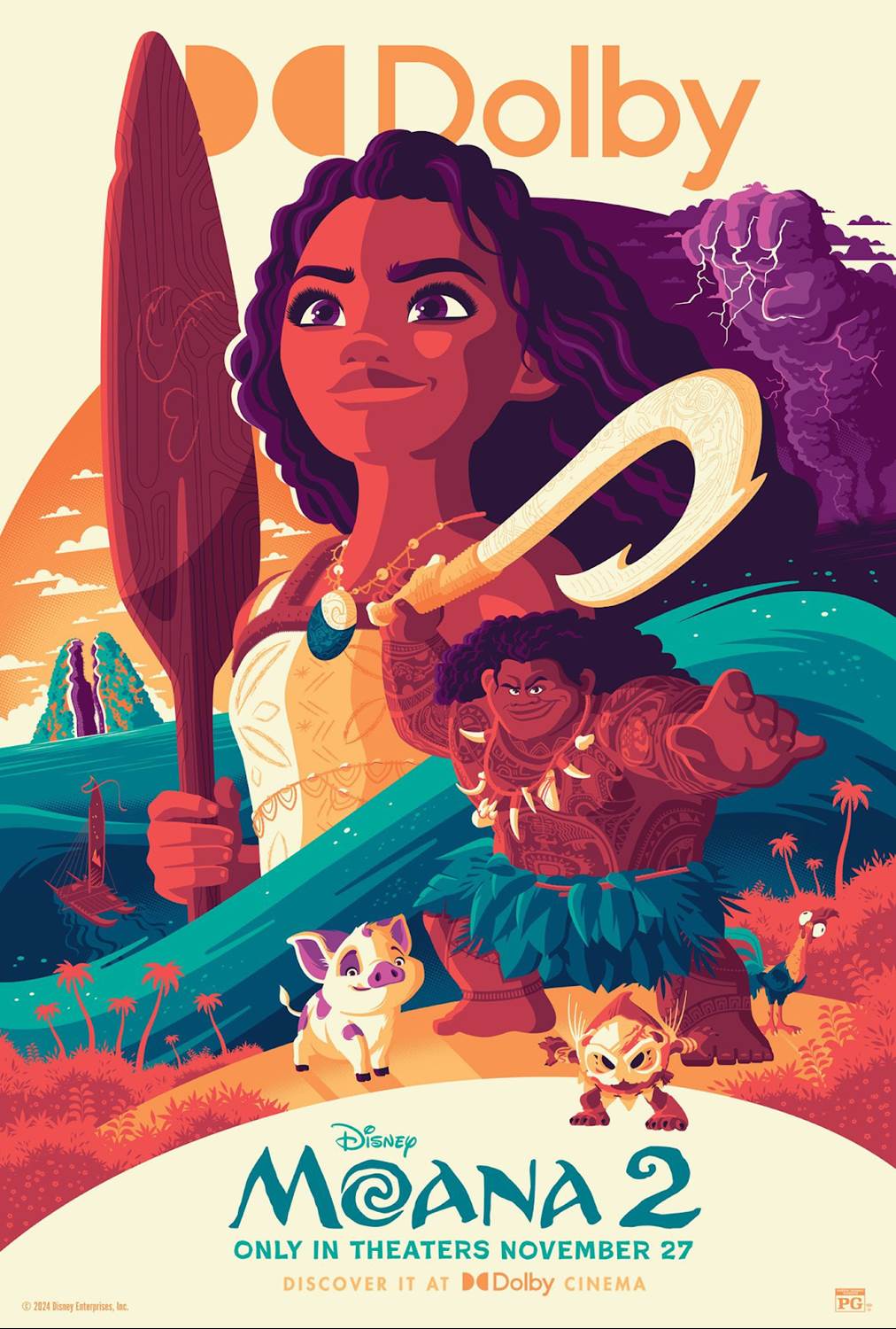 - Possibly the most unique poster though is the release for Dolby screenings. It’s a highly stylized take, especially when compared to the last three, with Moana front and center as she should be, with the same surrounding characters (Pua, Maui, A Kakamora) featured and the island imagery of the film matching the style.