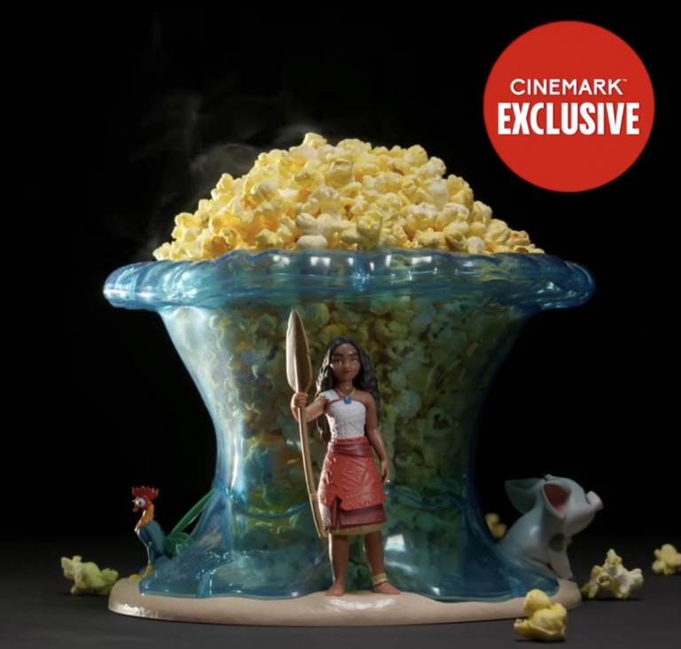 Last week, Cinemark showcased their elaborate sculptural popcorn bucket formed from translucent “water," pouring up and over to hold the popcorn inside. The exterior also features smaller figures of characters from the film, including Moana herself, Hei Hei, and Pua. Maui’s hook is also featured.