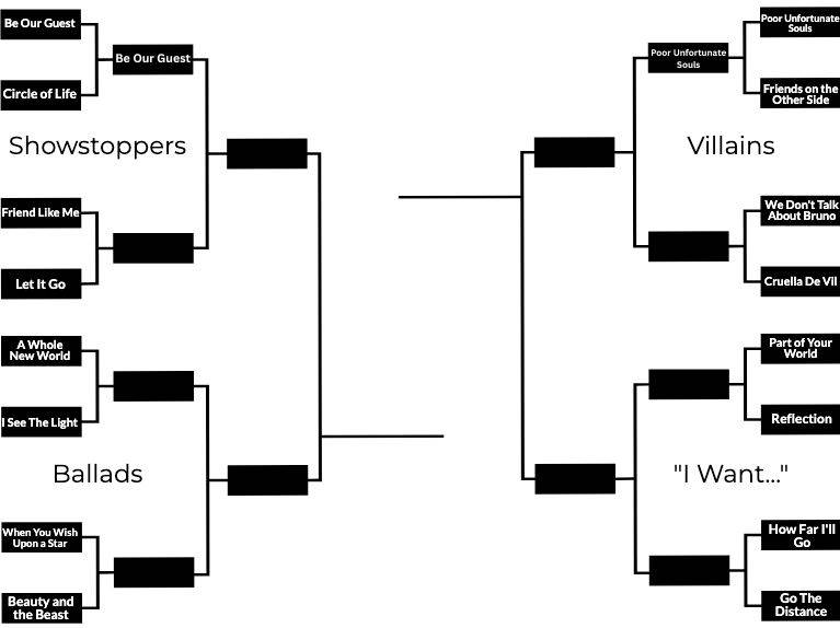 This next matchup will take us over, sideways and under as we head to the Ballads region where “A Whole New World" from Aladdin is the top seed. As disney love songs go, this might just be the very best. We’re going to find out if that’s true though as it has some stiff competition in this region to get to the Final 4. Will we see a shining, shimmering, splendid performance from the top seed?