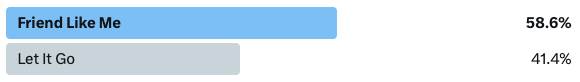 Before we move on to our next matchup, let’s take a look at our last result. It wasn’t as close as we might have expected. The magic of the Genie was enough to overcome Elsa and move “Friend Like Me" on to the next round over “Let It Go." Oh well, the polls never bothered us anyway.