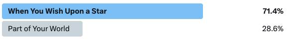 That’s right! “When You Wish Upon a Star" is our winner! The Disney theme song and Pinocchio classic defeated “Part of Your World" easily, winning by a final score of 71-29.