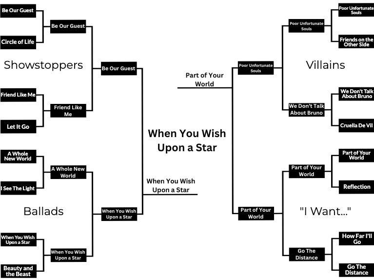 We saw consistent dominance from “When You Wish Upon a Star" throughout this tournament. As the second seed in the Ballads region, the tune easily took out “Beauty and the Beast" 66-34 in the first round. Our champion then cruised to another 66-34 victory, upsetting the top-seeded “A Whole New World." Things got a bit closer in a Final 4 matchup with “Be Our Guest," but “When You Wish Upon a Star" was still able to take down a 60-40 victory. Clearly, this Disney classic was underestimated when the bracket was made as, whether its the status as the unofficial Disney theme song or it just truly is the public’s favorite song, “When You Wish Upon a Star" should have been given a top seed. Either way, the song is our Mouse Madness 10 champion!
