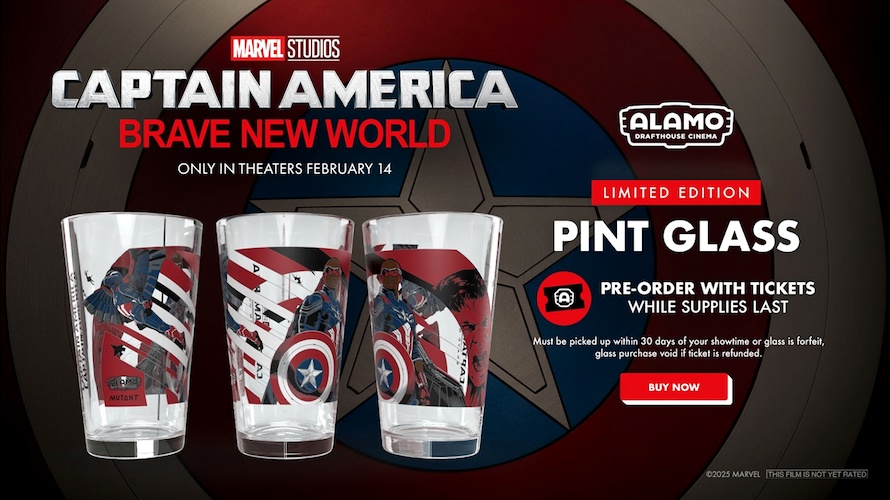 For those needing a little liquid courage to watch Sam Wilson standoff against Red Hulk, Alamo Drafthouse has the perfect souvenir for you. When purchasing tickets for the MCU theatrical event, moviegoers can pre-order the chain’s limited-edition Captain America: Brave New World Pint Glass. The exclusive collectible was designed by artist César Moreno and is only available in limited quantities. You won’t want to miss out on this one.
