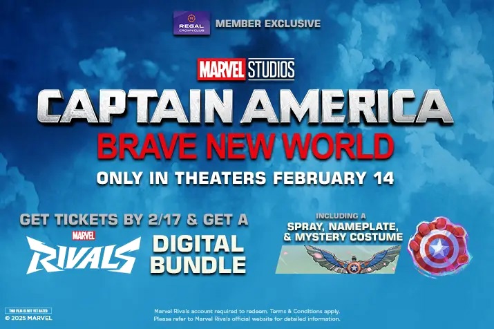 Regal Members who happen to play Marvel Rivals, buy tickets before February 17th to receive an exclusive digital bundle in the game that includes a spray, nameplate, and mystery costume.