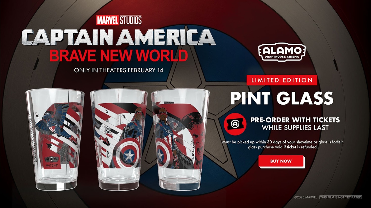 For those needing a little liquid courage to watch Sam Wilson standoff against Red Hulk, Alamo Drafthouse has the perfect souvenir for you. When purchasing tickets for the MCU theatrical event, moviegoers can pre-order the chain’s limited-edition Captain America: Brave New World Pint Glass. The exclusive collectible was designed by artist César Moreno and is only available in limited quantities. You won’t want to miss out on this one.