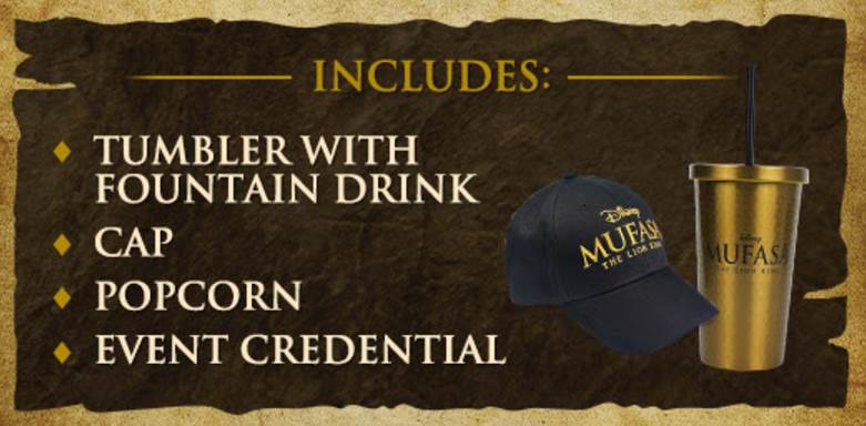 - The $63 per person event includes a reserved seat, a Mufasa hat, a Mufasa tumbler, a popcorn, a fountain drink and an event credential. You can grab tickets to the fan event here.
