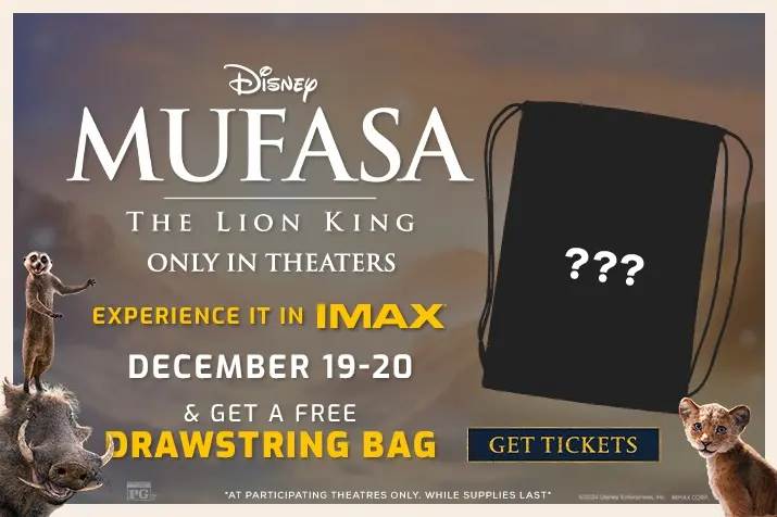If you head to Regal Cinemas and catch Mufasa: The Lion King in IMAX on December 19th or 20th can get a free Drawstring Bag. Note that this offer is only available at select locations while supplies last.